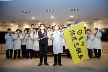 台中市政府衛生局今(23)日舉辦大隊授旗典禮,包括大台中醫師公會理事長魏重耀、台中市醫師公會理事長陳文侯、大台中診所協會理事長林釗尚、台中市診所協會理事長廖文鎮,及台中都診所協會理事長蘇主光均出席會場,並由曾局長為30位診所醫師志願軍代表授旗,齊聲宣誓,高喊「我們準備好了!」。