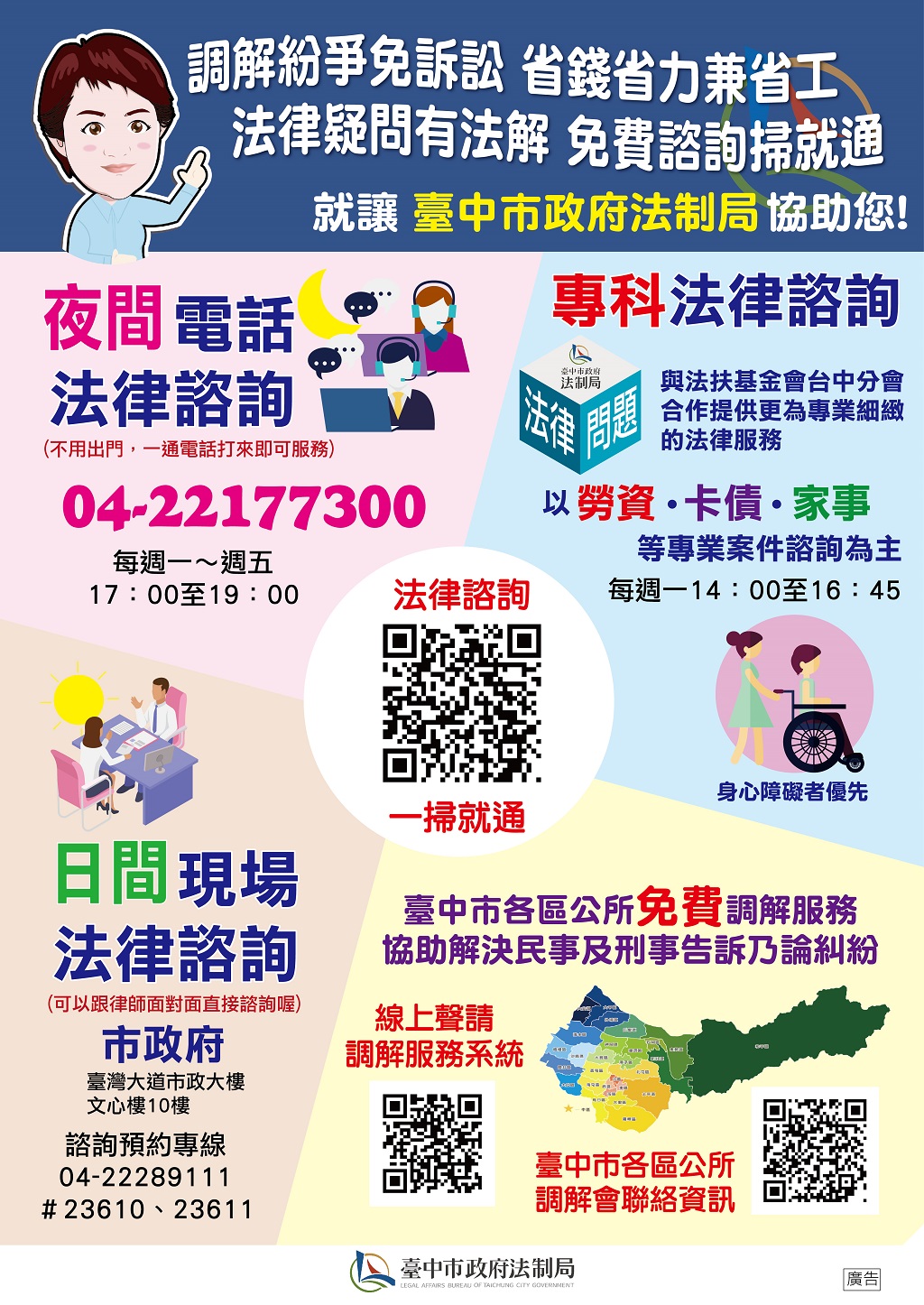 ◎勞資、卡債、家事等法律問題諮詢 星期一下午2點至4點45分。 臺中市政府法制局專科法律諮詢室。 每人諮詢時間為15分鐘。
