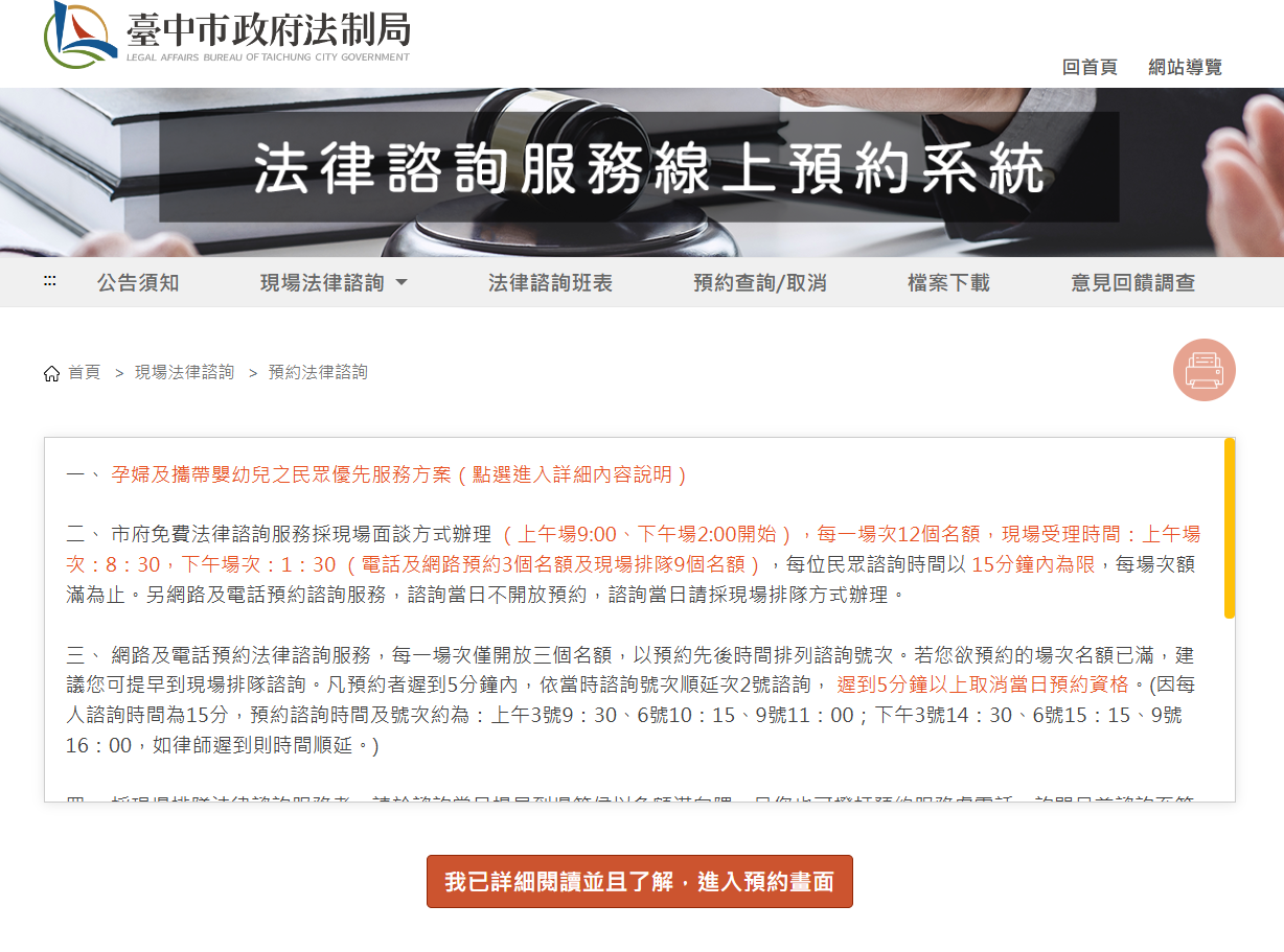 線上預約服務 https://legal-aid.taichung.gov.tw/Explanation/Index 週一至週五上午9點~12點及下午2點~5點。 臺中市政府法制局法律諮詢處