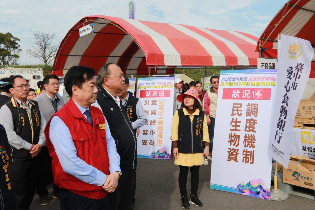 「2020台灣燈會緊急應變演練暨台中市109年災害防救演習」在后里區友達光電P2停車場舉辦,由后里區公所區長賴同一擔任指揮官,陳副市長在消防局長曾進財、社會局長彭懷真陪同下視察演練過程,中央則由內政部政務次長陳宗彥率相關部會評核官視察,盼透過強化演練,平時多一分準備、災時少一分災害。(1/22*18)*消防局