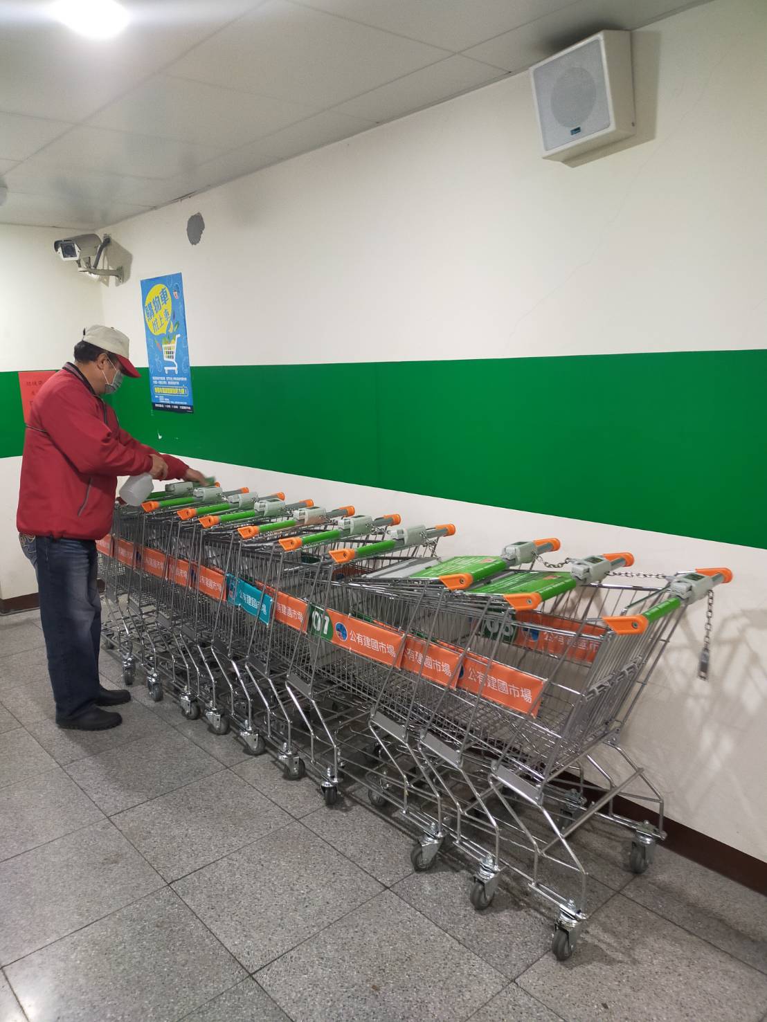 此外,每天加強公共通道、水溝清洗,以及電梯、購物車手把及廁所等消毒工作,並於電梯口及四大通道設置消毒酒精,讓進出市場的人,都能做好個人消毒工作,另利用市場FB粉絲專頁、LINE群組、網站、跑馬燈及電子看板等多元管道,加強宣導防疫注意事項。