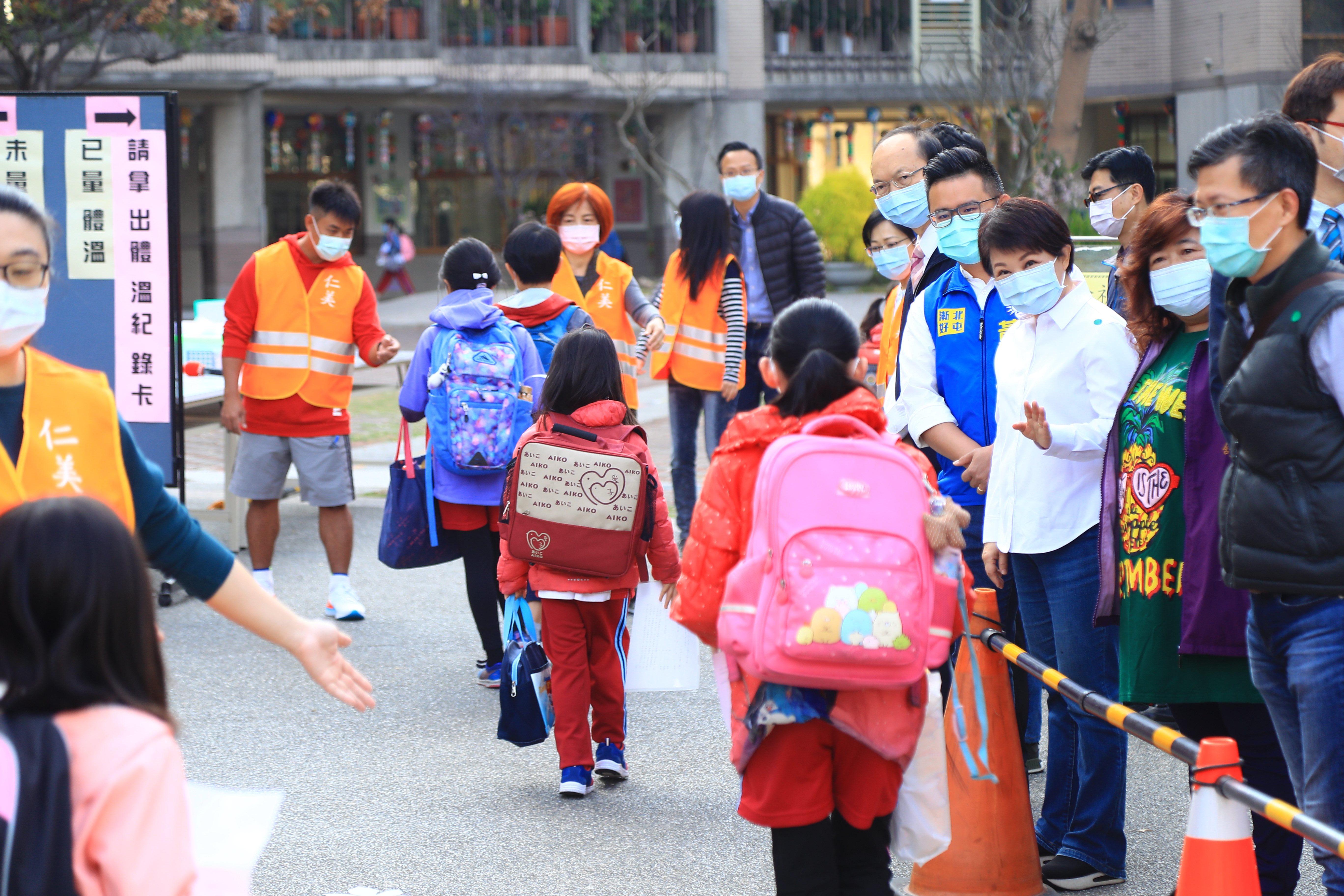 全國高中職以下學校今(25)日開學,為確保學校落實防疫工作,市長盧秀燕親自前往北屯區仁美國小關心學生入校前體溫量測情形,並於教室外視察衛教宣導課程。盧市長表示,市府全力備戰,已協助將全市高中職以下學校完成校園消毒,同時督促各校依據SOP展開防疫演練及物資整備,目前防疫物資都已備齊,「台中市準備好了,大家可以放心!」