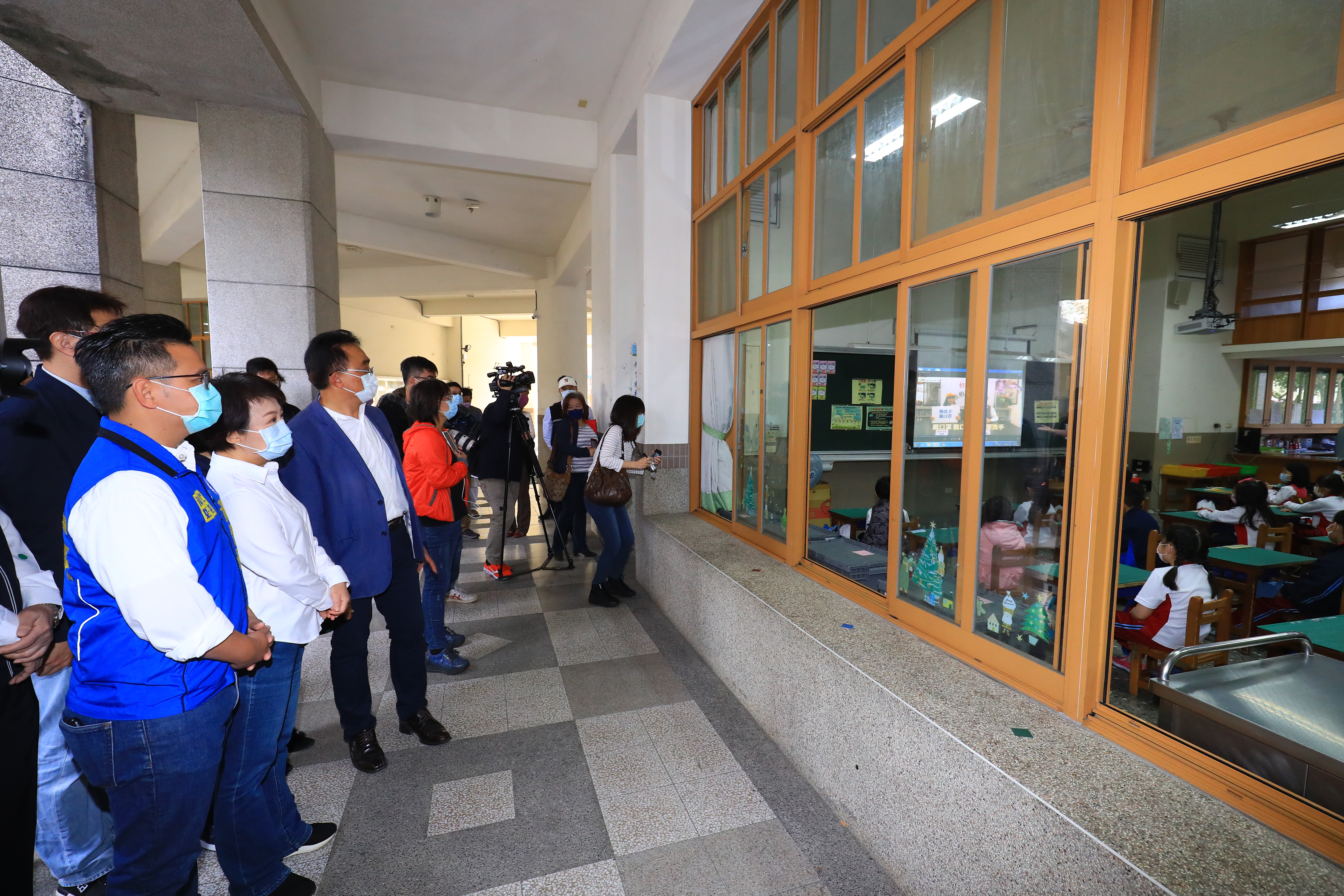 盧市長今日在教育局長楊振昇、仁美國小校長張永雄陪同下,親自視察仁美國小開學日校園防疫情形,市議員黃健豪也到場關心。(2/25*7)*教育局