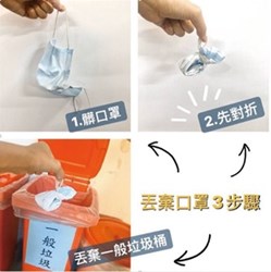 環保局長吳志超提醒,正確丟棄口罩方式,應先提口罩兩側的耳掛繩,將白色防護層向外反折,有顏色面向內,再丟棄至一般垃圾桶,丟完再用洗手乳(液)洗手,請民眾勿隨意棄置,一同維護乾淨市容。(4/2*22)*環境保護局