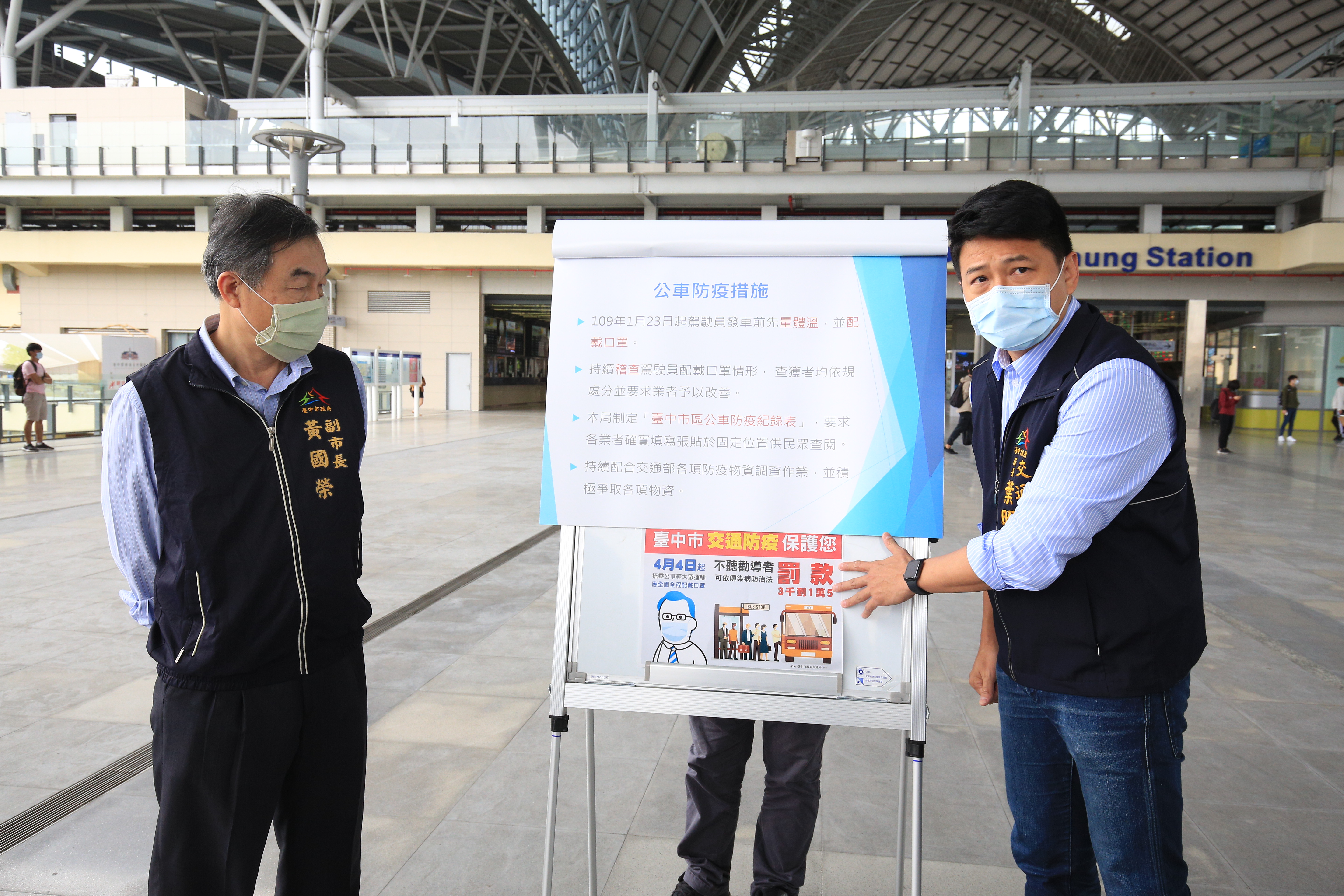 黃副市長在交通局長葉昭甫陪同下前往台中轉運中心,並上公車向搭車民眾宣導新規定,黃副市長指出,4月9日中央口罩實名制升級後,成人口罩購買數量增為14天9片,兒童口罩增為14天10片,民眾才有足夠數量來確實遵守相關規定,因此,目前針對未戴口罩民眾採柔性勸導,司機將予以拒載,如勸導不聽者才會依傳染病防治法開罰。