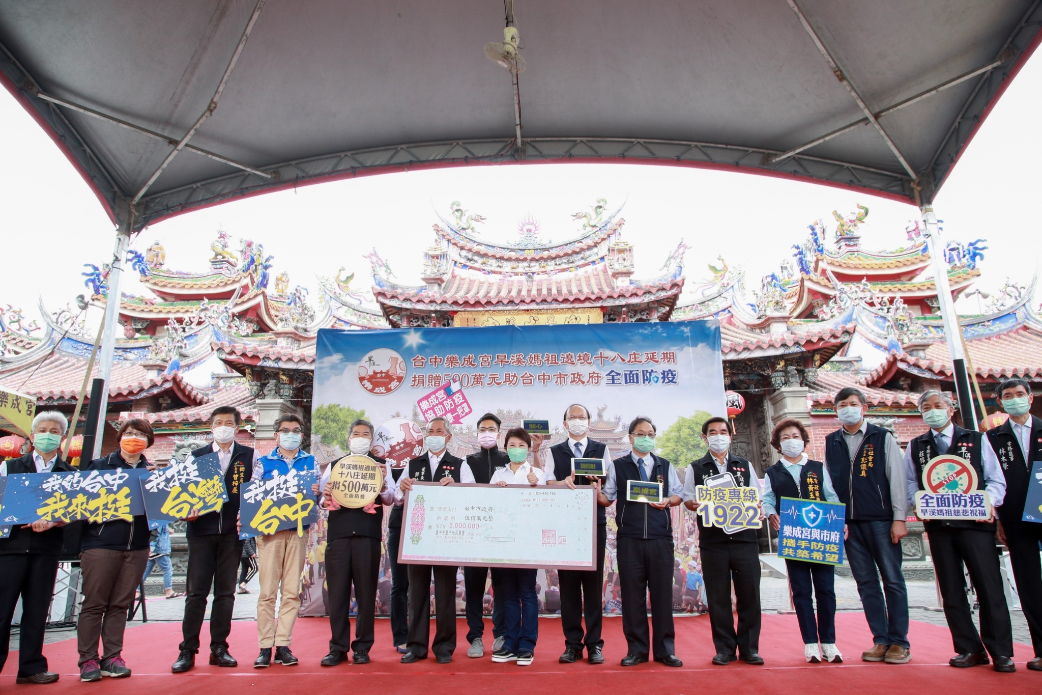 因應新冠肺炎疫情,台中市樂成宮今年「旱溪媽祖遶境十八庄」活動延期舉辦,樂成宮相挺在地,將原訂支應遶境的500萬元經費,捐給台中市政府作為防疫基金,今(11)日舉行捐贈儀式,由市長盧秀燕代表受贈,並頒發感謝狀給廟方,此筆經費將用於添購平板電腦480台及額溫槍80支,充實教育防疫設施。