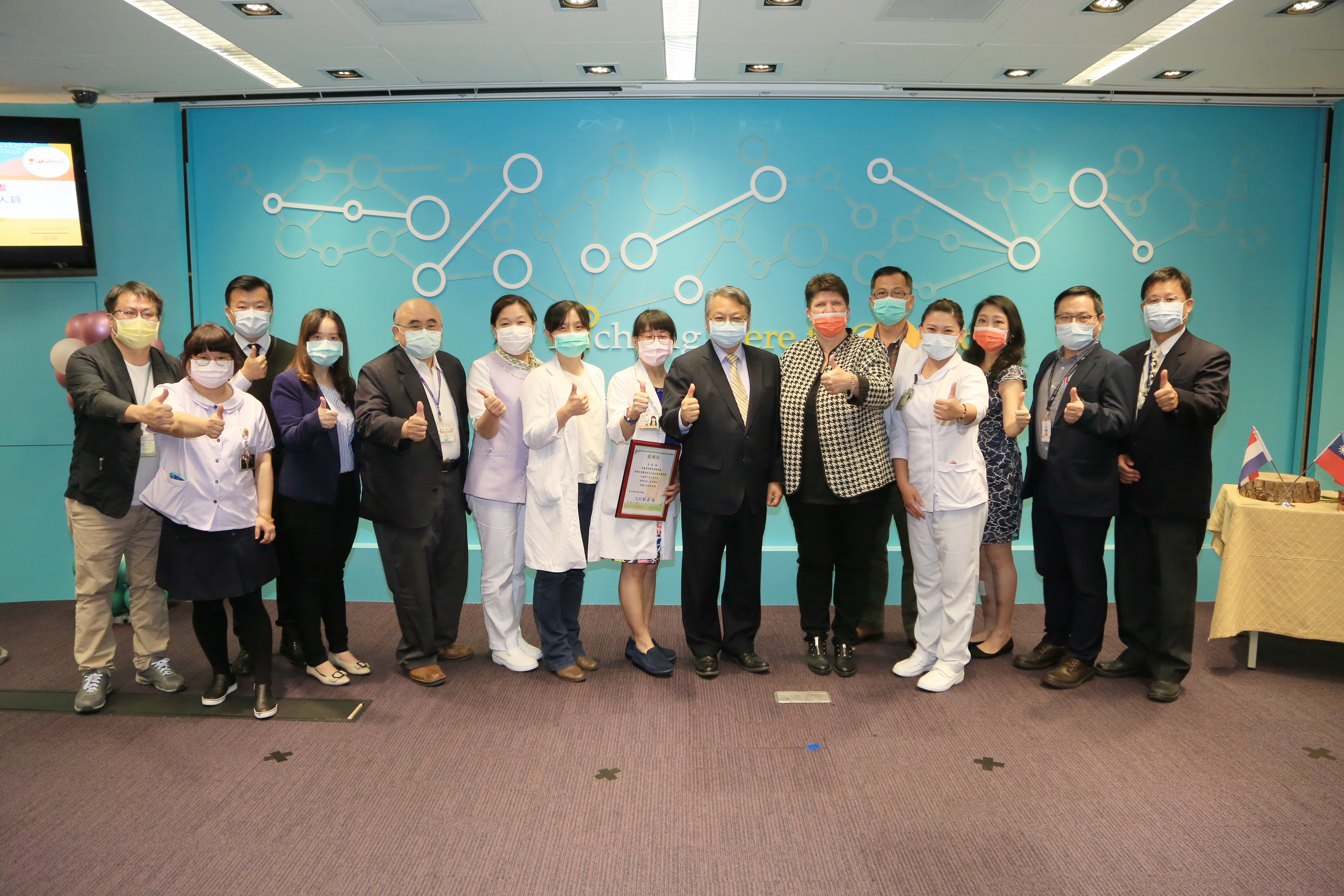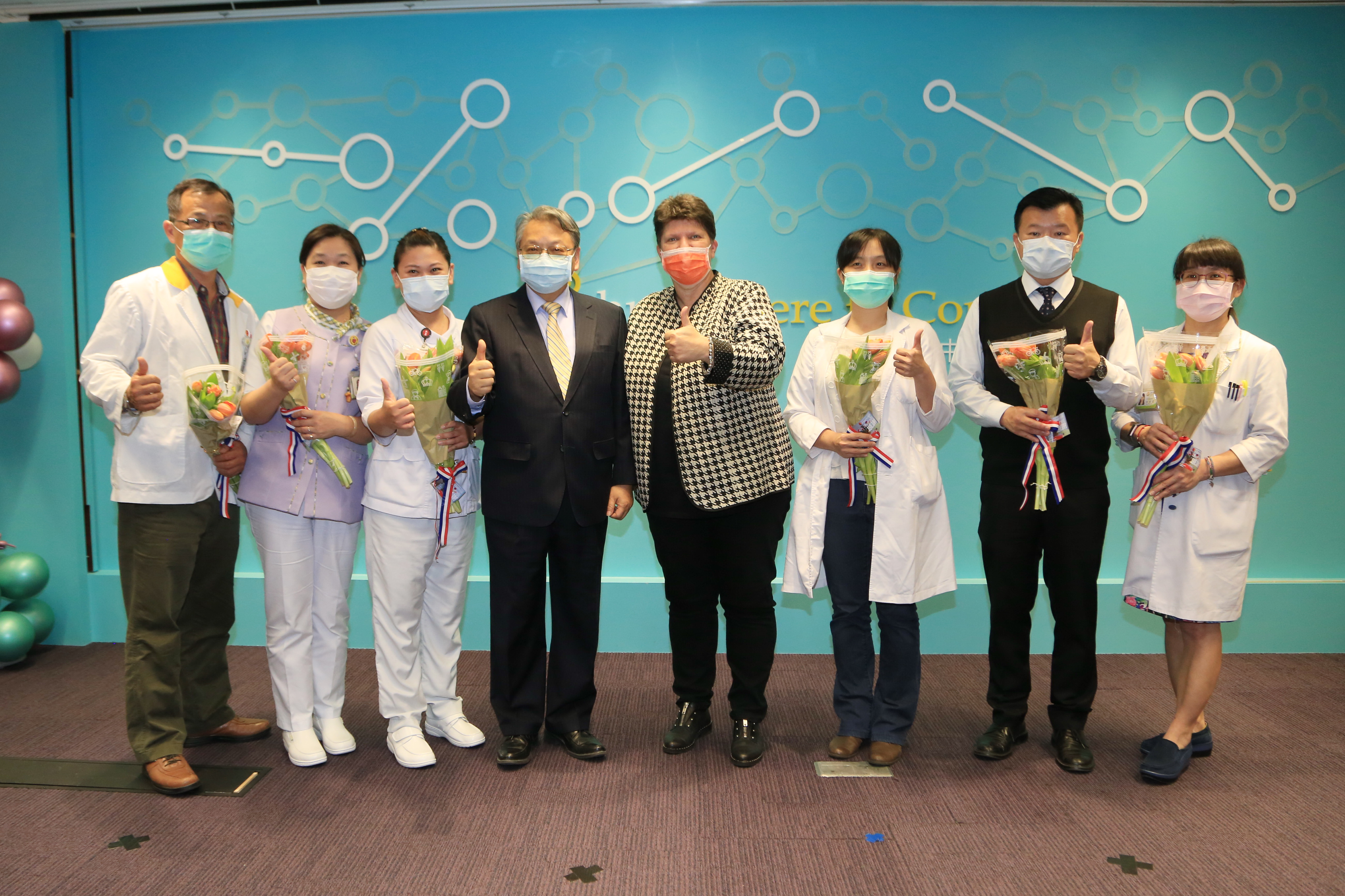 衛福部台中醫院林副院長說,橘色鬱金香象徵熱情、勇氣與希望,醫護人員在防疫的路上非常艱辛,要勇敢堅定地往前走,需要社會大眾的支持與鼓勵,很高興收到荷蘭代表處贈送的鬱金香,她回去就能告訴所有臨床一線同仁:「我們得到更多勇氣,所以在防疫的路上要更堅定!」