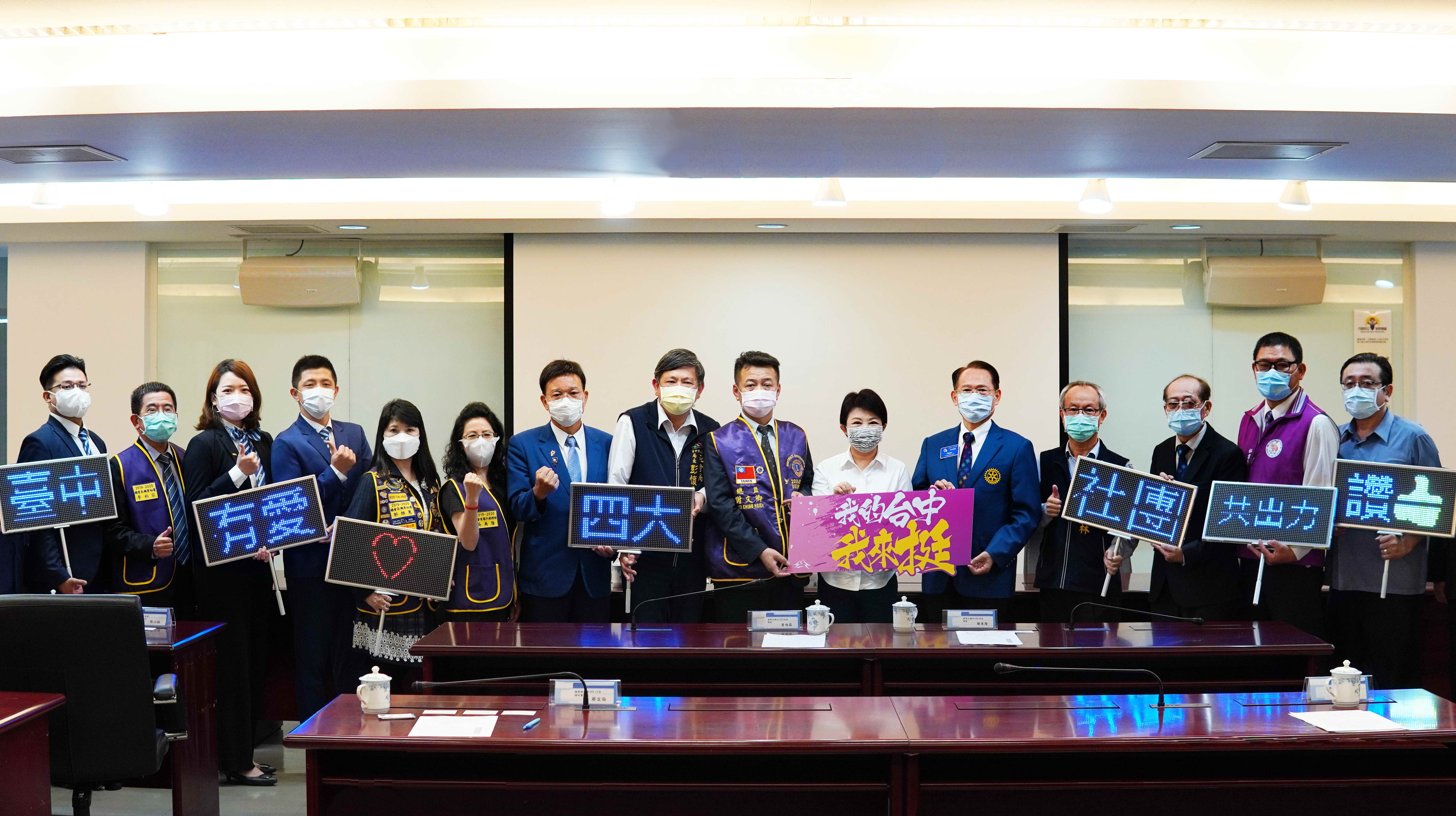 「我的台中 我來挺」活動日前在台灣大道市政大樓舉辦,扶輪社、青商會、獅子會、同濟會四大國際社團代表共同出席,盧市長、社會局長彭懷真等人到場致意。(5/4*8)*社會局
