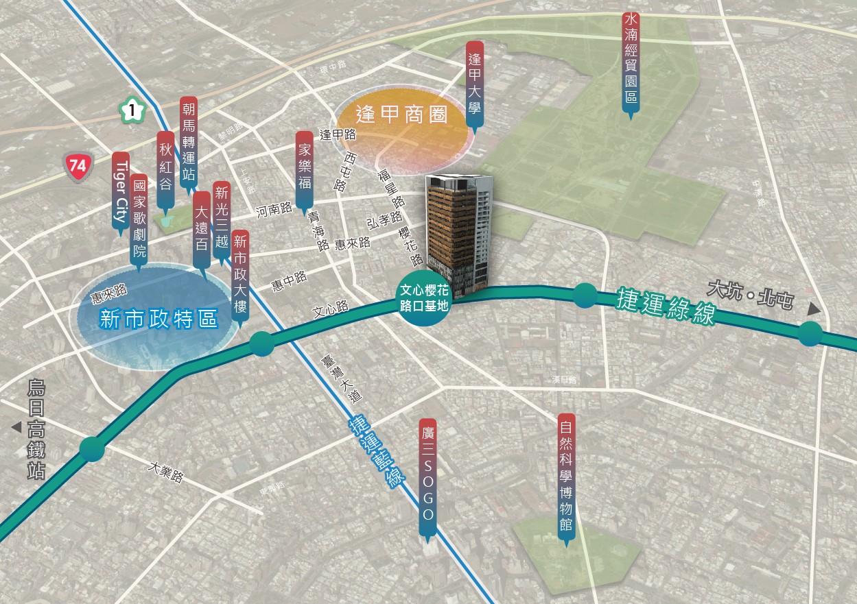 葉局長說明,文心崇德路口基地面積700坪,文心櫻花路口基地面積500坪,兩基地建蔽率及容積率均為70%及500%,預估總銷可達27億元及17億元,容許使用項目比照商業區,市府不預設立場,由投資人依市場機制充分發揮,歡迎慧眼獨具的投資人共同參與,打造台中捷運綠線璀璨雙星。