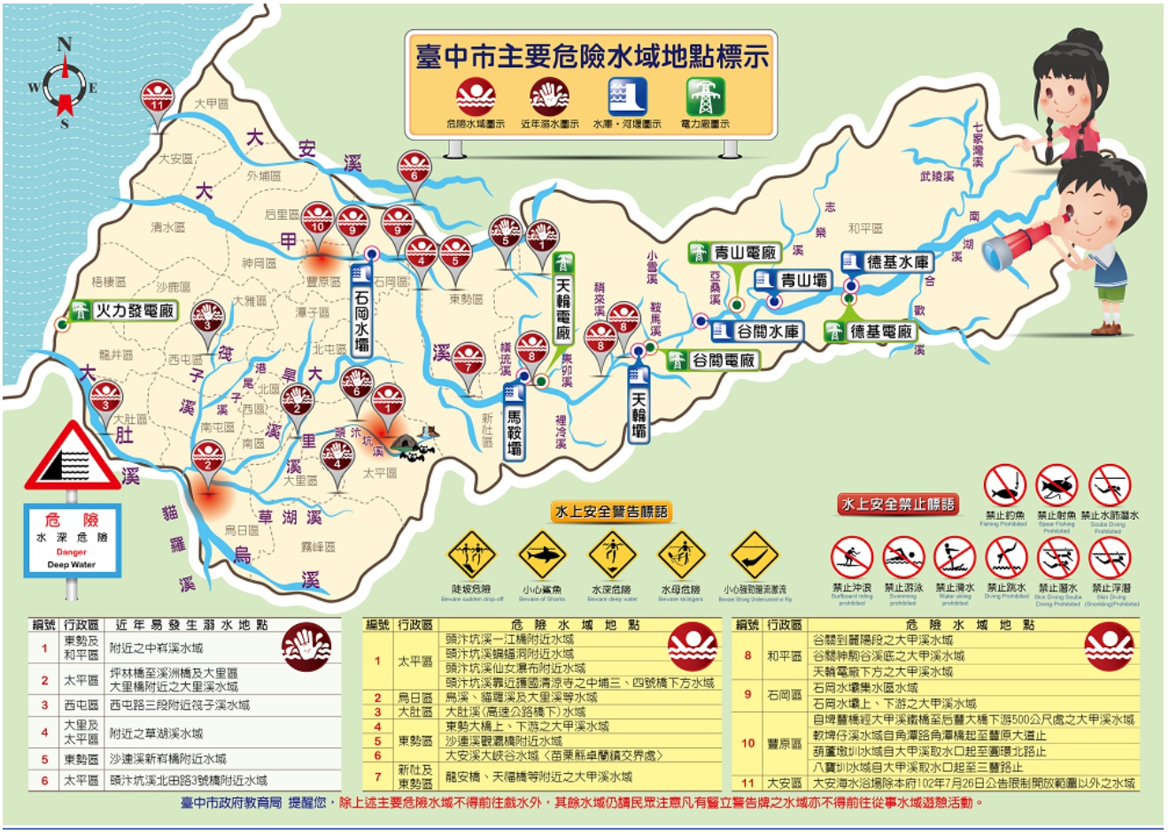 觀旅局提醒,台中市公告11處危險水域地點,屬於水流湍急、水域深淺不一、水下岩石多、小迴流區、漩渦、水面平靜而水下為深潭、有暗流及低溫等,易發生民眾靠近戲水失去戒心而造成溺水意外事故,有鑑於此11處危險水域在過去曾多次發生溺水意外事故,呼籲民眾勿拿自己的生命開玩笑,切勿前往從事任何水域活動,危險水域查詢網址(http://anti-drowing.tc.edu.tw/12a.html )。