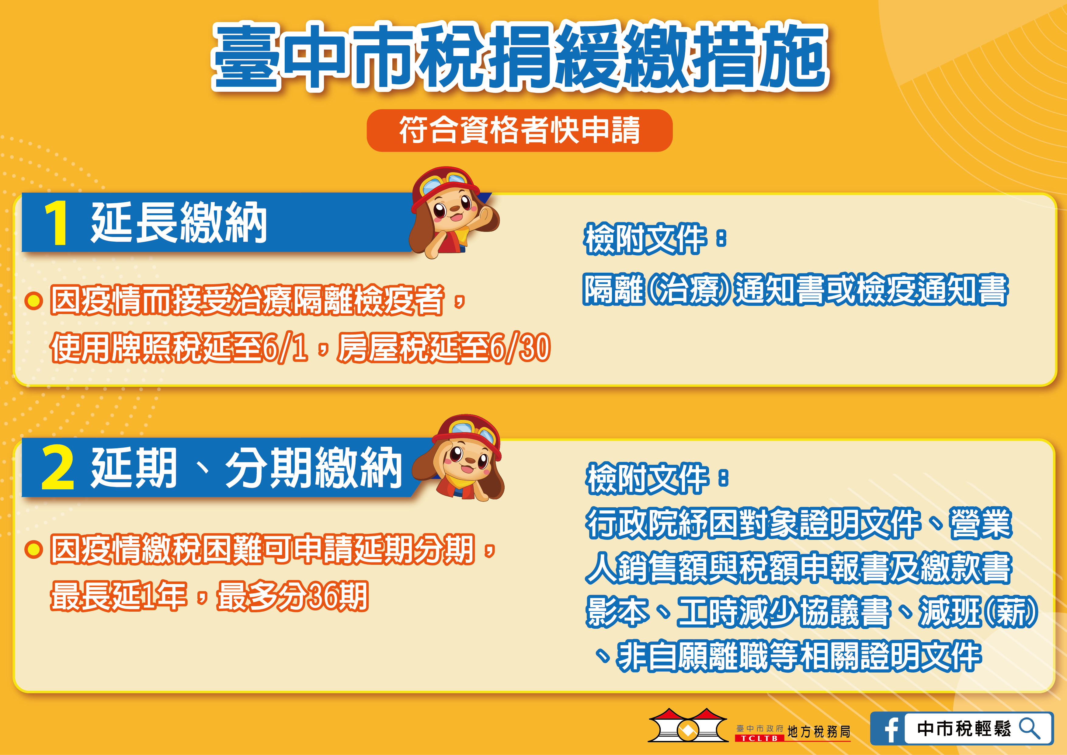 新冠肺炎疫情衝擊經濟,台中市政府地稅局提供民眾減免使用牌照稅、房屋稅、娛樂稅,及有繳稅困難的民眾延期、分期繳納措施,迄今已有8千多件申請案,減稅金額超過5千萬元、緩繳金額達約2億5千萬元。地稅局表示,今年房屋稅繳納期限將於6月1日截止,呼籲受疫情影響、有繳稅困難民眾,儘速於期限內申請延期或分期。