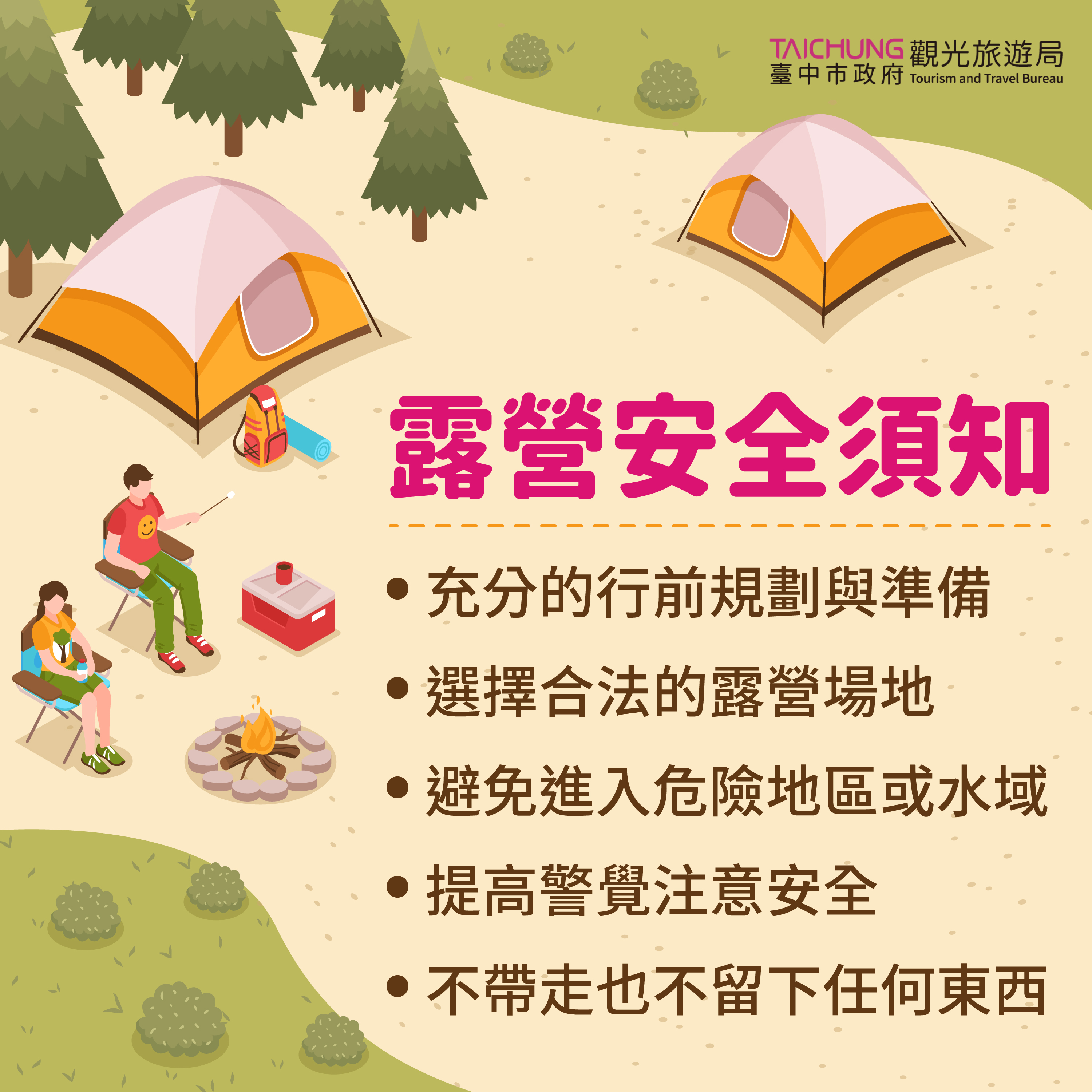 觀旅局提醒露營活動安全小叮嚀:1.充分的行前規劃與準備、2.選擇合法的露營場地、3.避免進入危險地區或水域、4.提高警覺注意安全、5.不帶走也不留下任何東西。