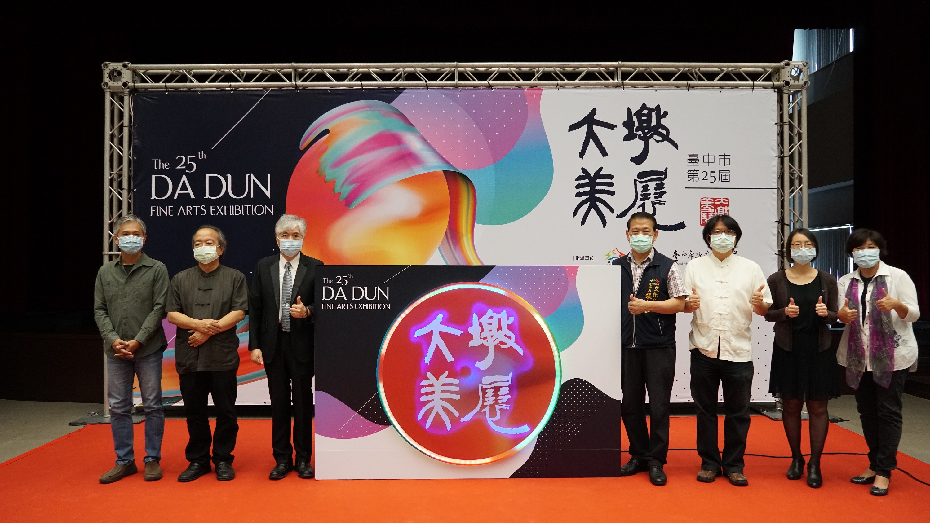 台中市政府文化局今(21)日在台灣大道市政大樓舉辦「台中市大墩美展」記者會,由文化局長張大春、評審委員詹前裕、程代勒及謝省民老師,與得獎者攝影類第一名陳姵如女士、油畫類第一名張國二先生、水彩類第一名余沛倫女士,共同邀請民眾前往觀展。