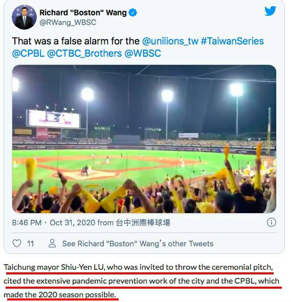 運動局表示,世界棒壘球總會11月1日(台灣時間)專文報導(https://www.wbsc.org/news/taiwan-series-open-with-uni-lions-taking-first-win-in-extra-inning )台中的防疫作為及職棒總冠軍賽成功,肯定市長盧秀燕帶領的市府團隊與中職聯盟所做的防疫努力,讓今年職業賽事順利舉行。