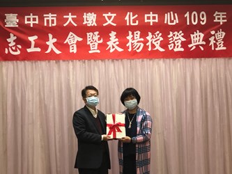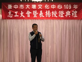 張局長表示,今年雖然受新冠肺炎疫情衝擊,但大墩文化中心是全國知名的藝文場館之一,參訪民眾連年單月逾23萬人次、業務十分繁忙,有賴於館內140位志工,協助大墩藝廊視覺藝術、中山堂表演藝術及中心藝文研習課程與大墩大師講堂等重要藝文推廣活動,為大墩文化中心灌注許多運營能量。