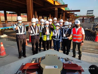 陳局長提到,隔震器性能保證測試會驗在去年10月13日於台灣時間下午2時一路測試至翌日凌晨1時,建設局、工程團隊、建築專業委員及結構技師公會技師皆於工地現場待命,以即時錄影監看測試過程,確保品質不打折,終於完成全數109組隔震器測試,並提早將隔震器運抵工地。