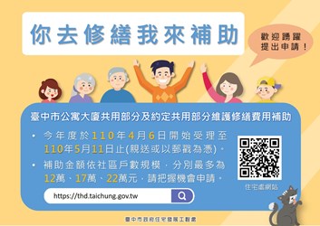 110年度台中市公寓大廈共用部分及約定共用部分維護修繕費用補助將4月6日正式開辦,歡迎