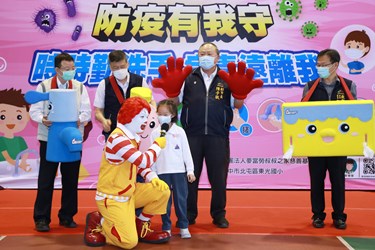今日活動現場由麥當勞叔叔透過洗手歌帶動唱及遊戲,教導小朋友正確洗手及佩戴口罩,才能有效預防腸病毒及新冠肺炎侵襲;副市長陳子敬、衛生局長曾梓展、疾病管制署中區管制中心主任吳智文、台中市議員黃健豪、教育局專門委員郭明洲及北屯區長歐陽明等人皆出席,市議員沈佑蓮、陳成添、曾朝榮及謝明源派員關心。(4/9*11)*衛生局