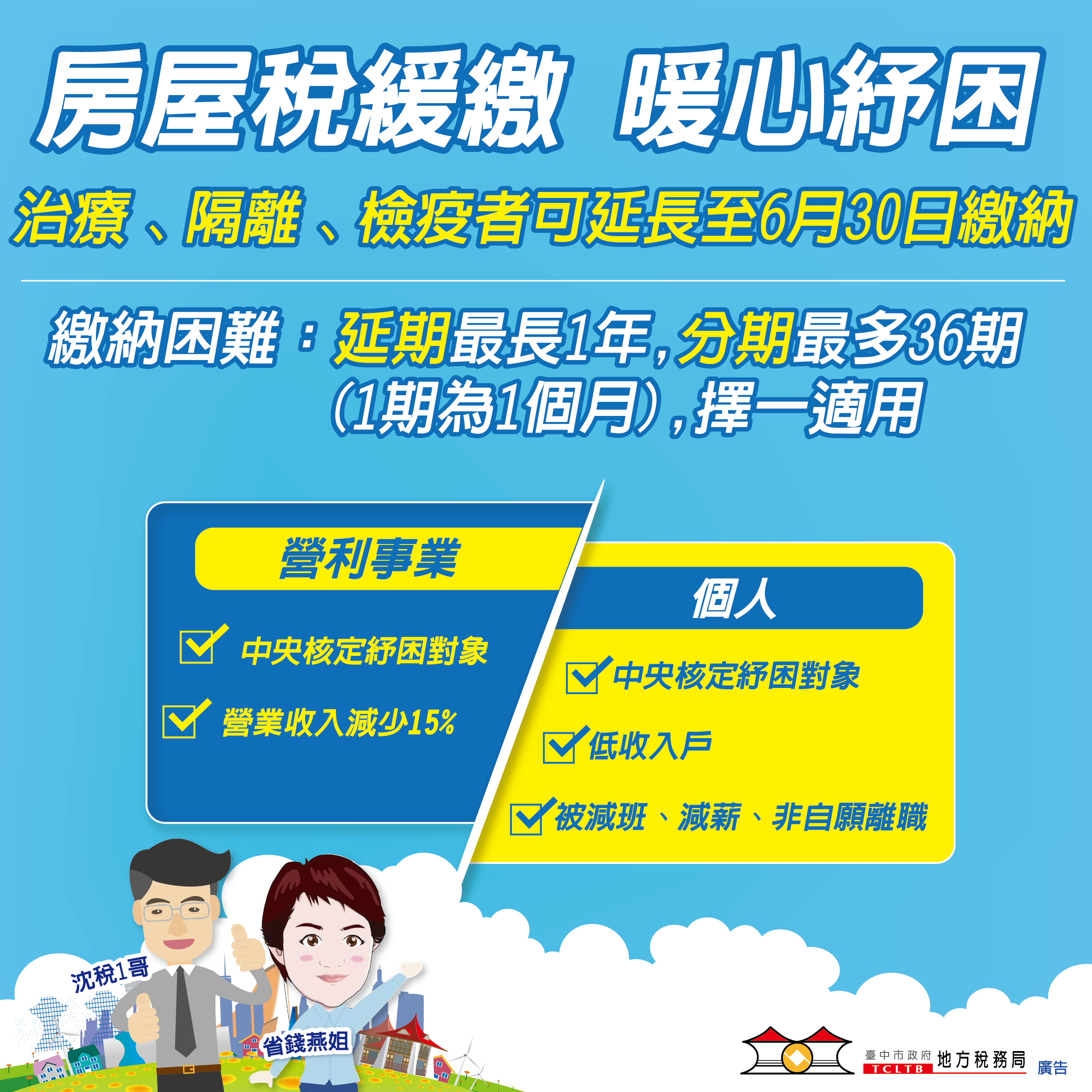 地方稅務局說明,受疫情影響,個人或法人、非法人團體負責人或主辦會計人員在房屋稅法定繳納期間內接受隔離治療、居家隔離、居家檢疫、集中隔離、或集中檢疫,繳納期限可延長至今年6月30日。