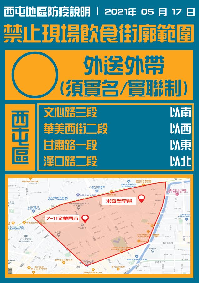 經發局長張峯源表示,市府已請個案足跡所涉店家暫停營業,待店家完成消毒作業後,經市府審核同意才可以復業;另,市府匡列西屯區文心路三段以南、華美西街二段以西、甘肅路一段以東、漢口路二段以北為禁止現場飲食範圍,外送外帶須落實實聯制。(5/17*8)*新聞局