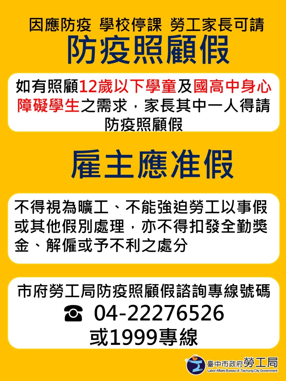 針對外界關心學生停課,家長如何請假照顧,勞工局長張大春說明,勞工如有照顧12歲以下學童需求,家長其中一人得請「防疫照顧假」,累計最多可請假14天,雇主不得拒絕,也不得視為曠工、或強迫勞工以事假或其他假別處理,亦不得扣發全勤獎金、解僱等處分,市府防疫照顧假諮詢專線號碼04-222765261999專線。