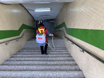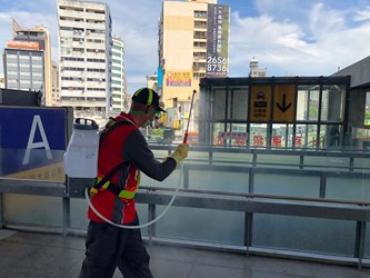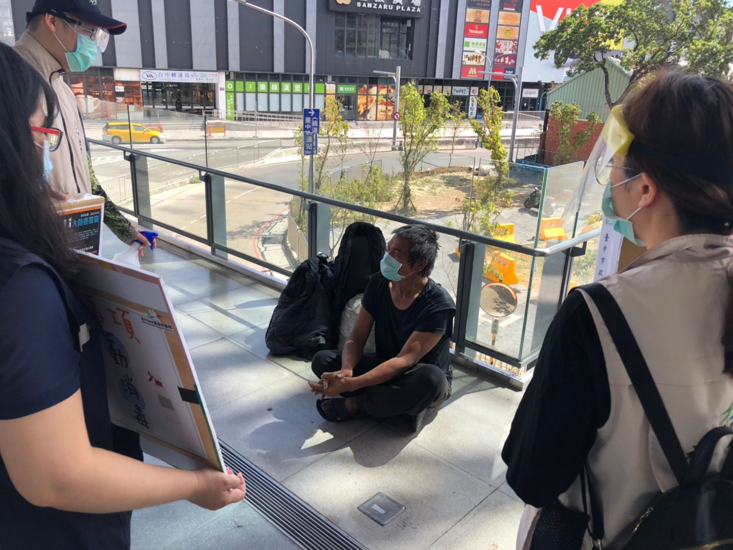 新冠肺炎疫情嚴峻,為降低傳播風險,台中市政府環保局與社會局攜手合作,執行「街友關懷專案」,昨(20)日環保局動員4區清潔隊,計13名防疫消毒人員,出動背負式噴霧機8台及水霧式消毒車5輛,針對火車站、公園等23處街友聚集區域,進行地毯式環境消毒;社會局也提供手部消毒及主動發放口罩予街友,提醒市民配合政府防疫措施,保護自己也保護他人。