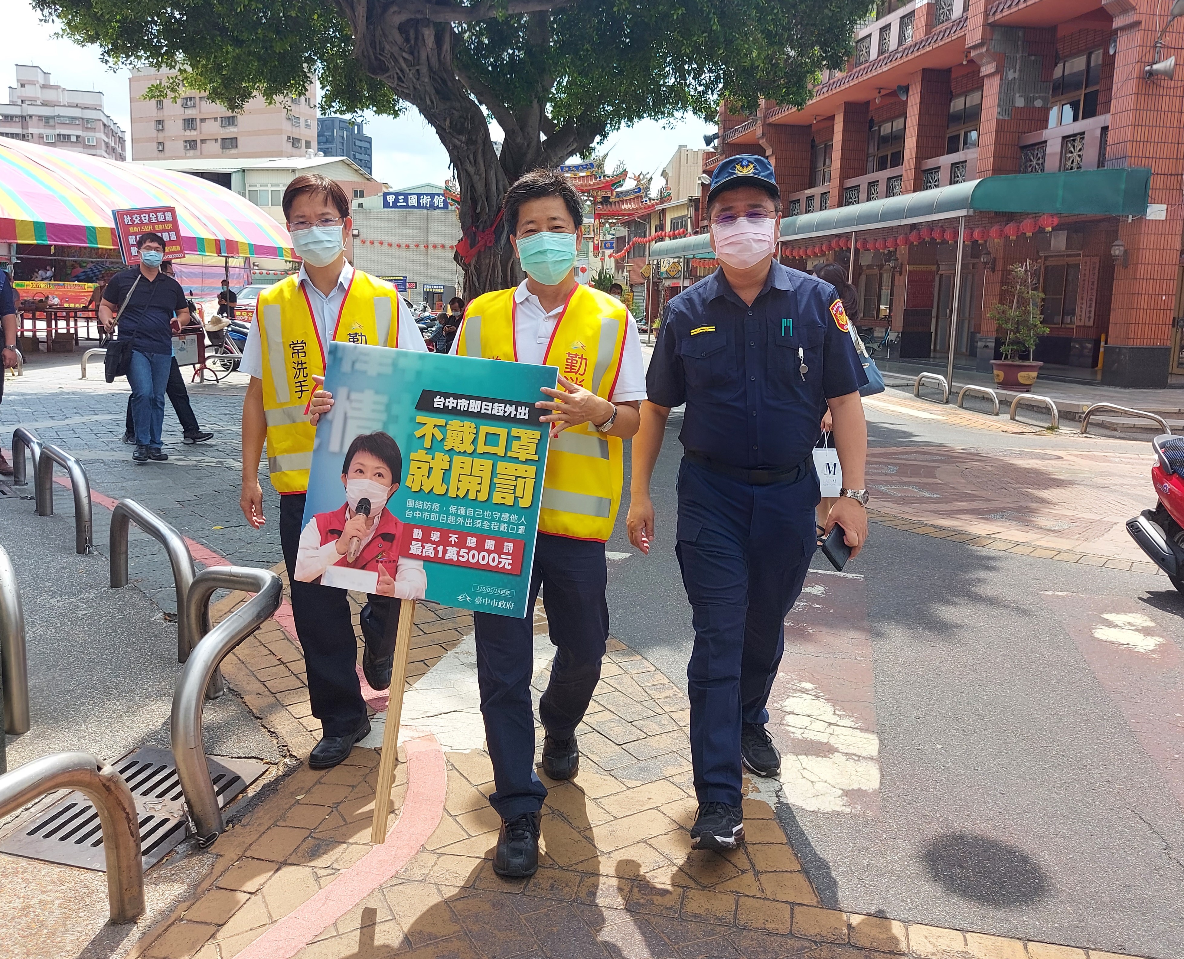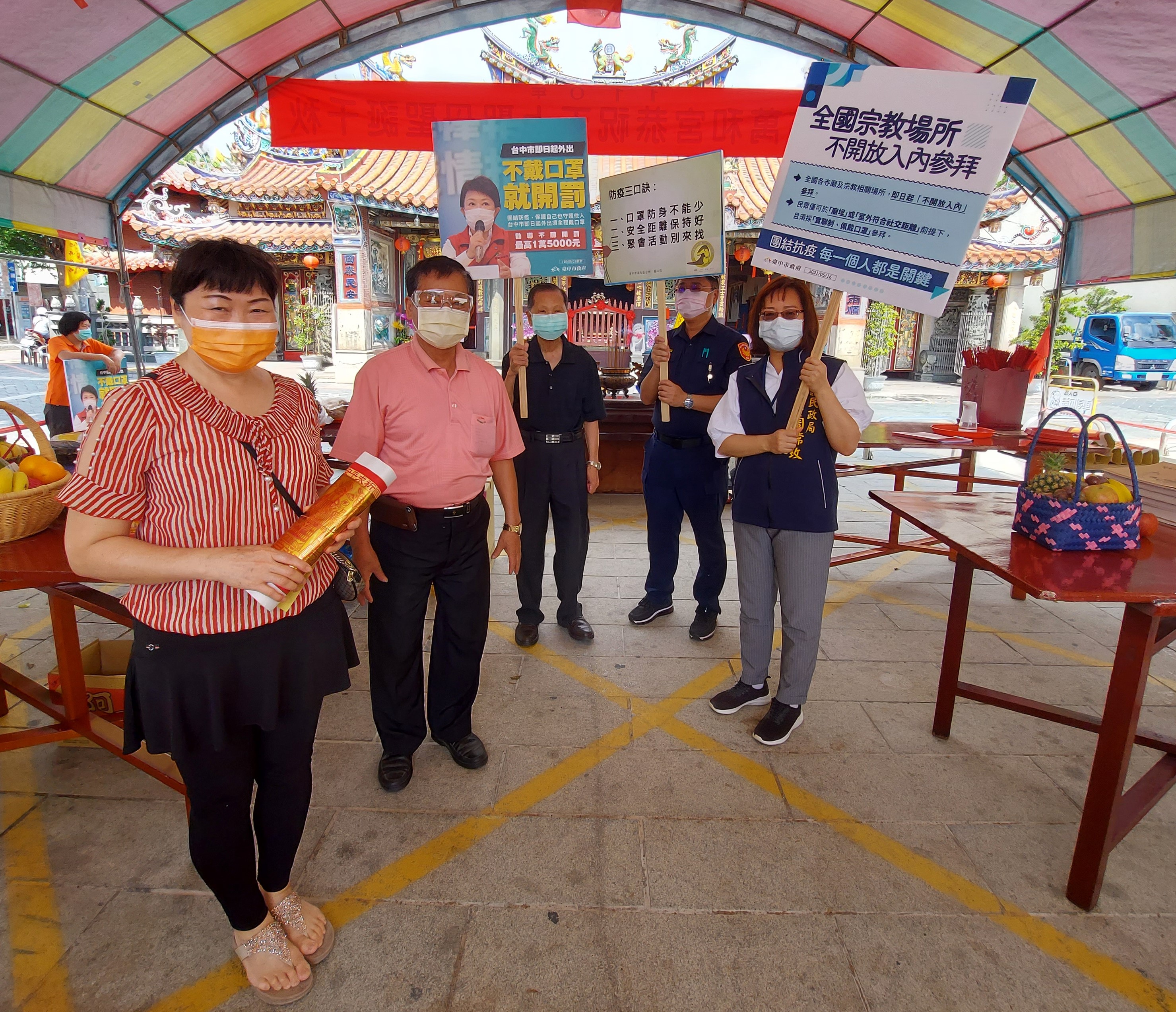 國內疫情嚴峻,中央疫情指揮中心宣布全國升至第三級警戒,民眾外出須全程佩戴口罩,經勸導不聽最重可罰15,000元。台中市政府民政局副局長周瑺玫今(21)日前往南屯區萬和宮和文昌公廟視察宗教場所防疫情形,同時加強防疫宣導,並呼籲民眾疫情期間避免參加聚會活動或前往人潮聚集、密閉空間的公共場所,若有特殊情況須外出時,也請全程佩戴口罩,落實防疫措施。