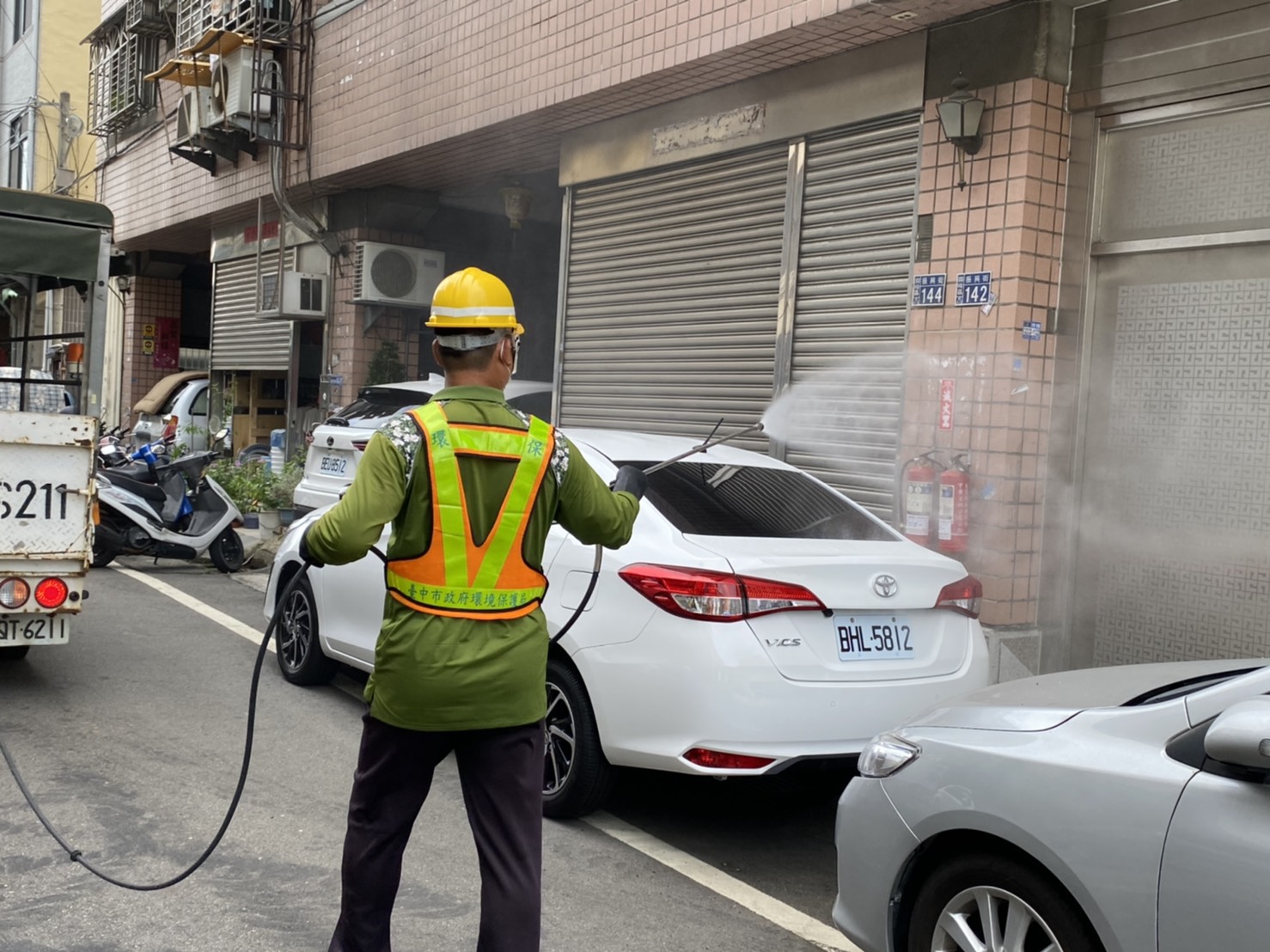 朝陽科技大學出現本土確診案例,台中市政府環境保護局繼20日及21日動員大批防疫消毒大隊人力及20輛次水霧式消毒車,進行確診足跡地點、朝陽科大當地區里及周邊重點區域沿街全面消毒作業後,今(22)日再度動員12個區隊,近50名人力及12輛消毒車輛跨區支援,鎖定霧峰區重點區域及朝陽科大夜唱團聚集點的東協廣場,執行地毯式清查大消毒,保護市民健康。