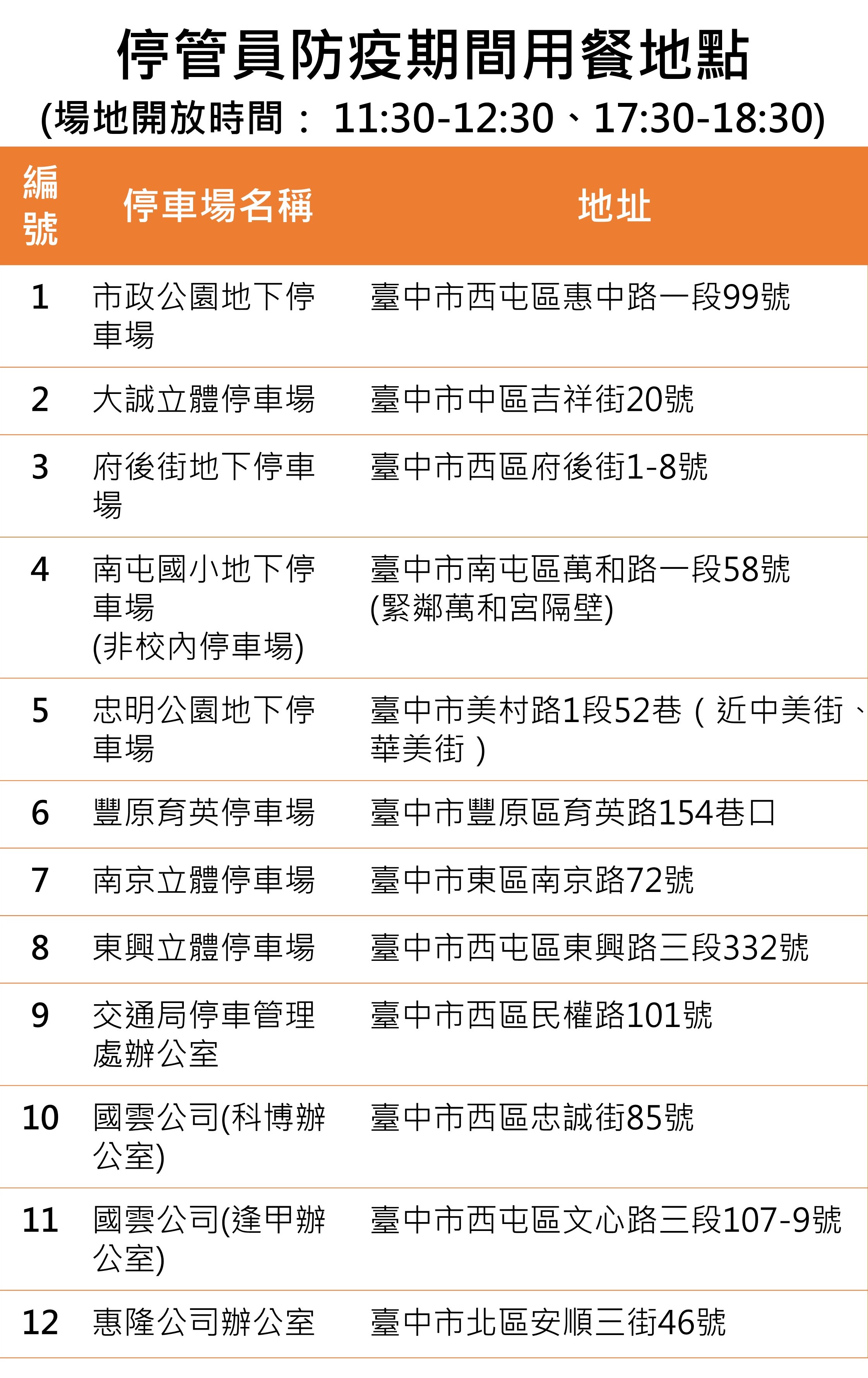 此外,交通局也延長停管員用餐休息時間至1個小時,並於每日上午11時30分至12時30分、下午5時30分至6時30分,於市政公園地下停車場、大誠立體停車場、府後街地下停車場、南屯國小地下停車場、忠明公園地下停車場、南京立體停車場、東興立體停車場、豐原育英停車場等處,在管理室內或旁邊試辦停管員用餐區,讓停管員於用餐時段購餐後可回到辦公室或就近至停車場用餐,市府後續再視成效滾動檢討。