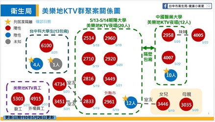 台中市政府說明,朝陽科大一行20人5月13日前往東協廣場美樂地KTV夜唱,其中8人確診、12人陰性,另又傳染給接觸者4人確診;隔壁中國醫藥大學夜唱團包廂一共12人,其中2人確診、10人陰性,另又傳染給接觸者1人確診;美樂地KTV則有一名廚工、一名外場員工,一共2人確診;今日新增第三間台中科大夜唱團包廂1人確診,累計此波群聚造成18人確診。