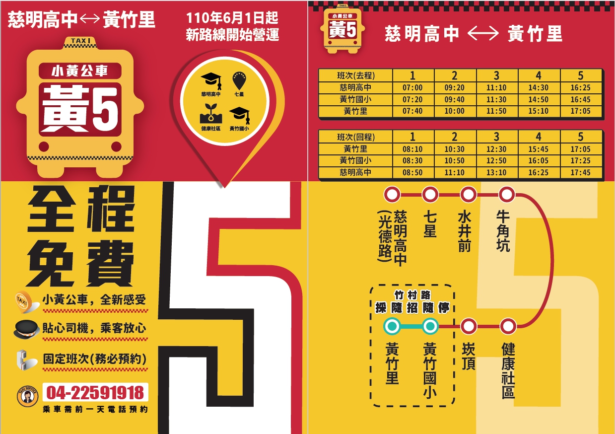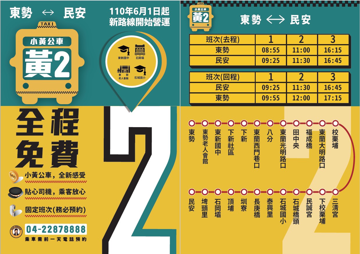 葉局長提醒,自61日起,小黃公車開始以新路線及班次營運,將同步更新小黃公車路線識別系統,也已陸續印製及配發廣告宣傳單,請小黃公車行經的各區公所及里辦公處協助發放給里民,請民眾搭乘時多加留意班次變更情形。