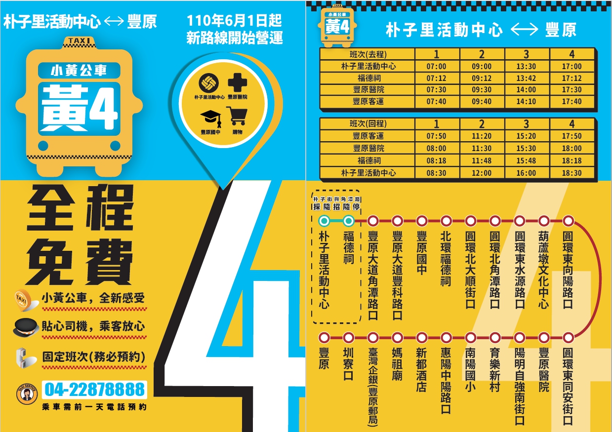 交通局長葉昭甫表示,小黃公車調整均是為滿足當地民眾購物、洽公、就學或轉乘需求,其中豐原區部分,黃1路原起迄點由豐原球場站調整為公老坪頂站;黃4路原起迄點由豐原醫院站調整為豐原站。另新社區黃3路部分,原起迄點由新五村站調整為中興嶺站,並於上、下午各增加一趟來回班次。