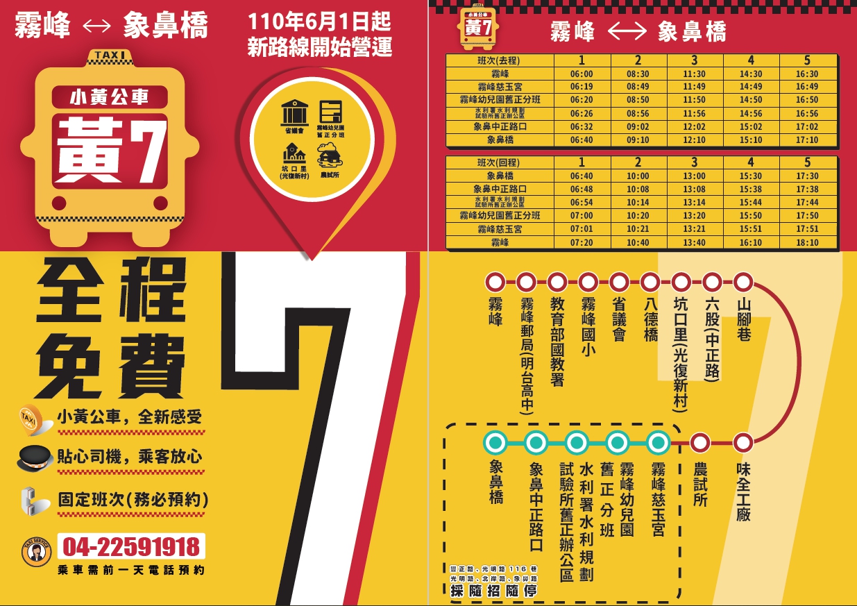 台中市小黃公車目前有8條路線,包括黃1路豐原球場線、黃2路東勢埤頭里線、黃3路新社新五村線、黃4路豐原朴子線、黃5路黃竹線、黃6路桐林線、黃7路舊正象鼻線、黃8路喀哩線,廣受偏遠地區民眾好評,市府交通局持續聽取地方意見滾動檢討,經會勘後將於61日調整其中7條路線或班次,讓服務品質更提升。