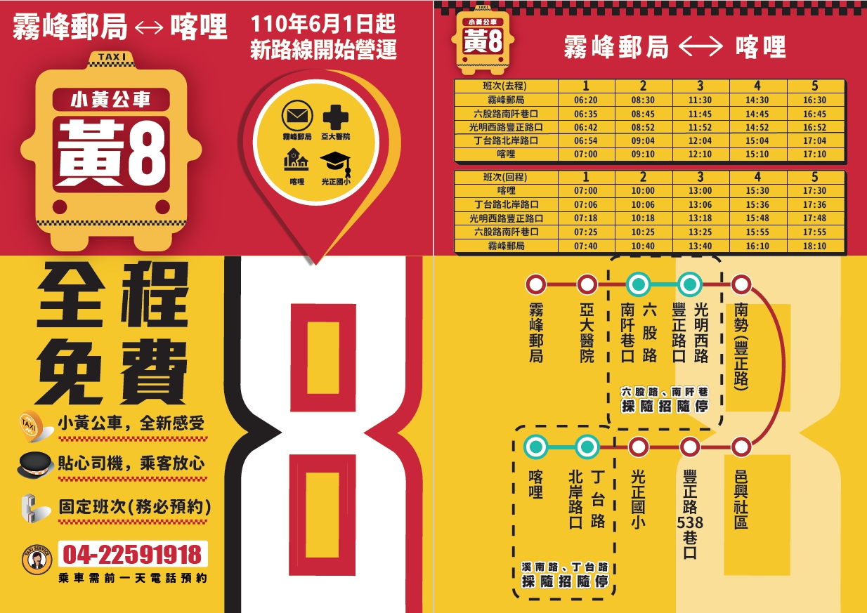 8路霧峰郵局至喀哩線部分,原末班車夜間7時發車來回班次,因該時段經統計搭乘需求低,經與當地里長溝通後,將該時段班次取消,末班車時間提早至下午430分班由霧峰郵局發車,並於530分由喀哩返程後收班。