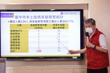 衛生局長曾梓展進一步說明,台中市家庭群聚感染相關性強烈,根據疫情趨勢分析,全市今年累計124例本土確診個案,其中美樂地KTV 4家庭群聚、累計18人,西屯泰安國小6家庭群聚、累計16人,東區2家庭群聚、累計8人,豐原區2家庭群聚、累計5人,潭子立揚鞋業2家庭群聚、累計11人,北屯區2家庭群聚、累計11人,另有其他5起零星家庭群聚、累計10人確診,全數共23起家庭群聚、79人確診,就佔63