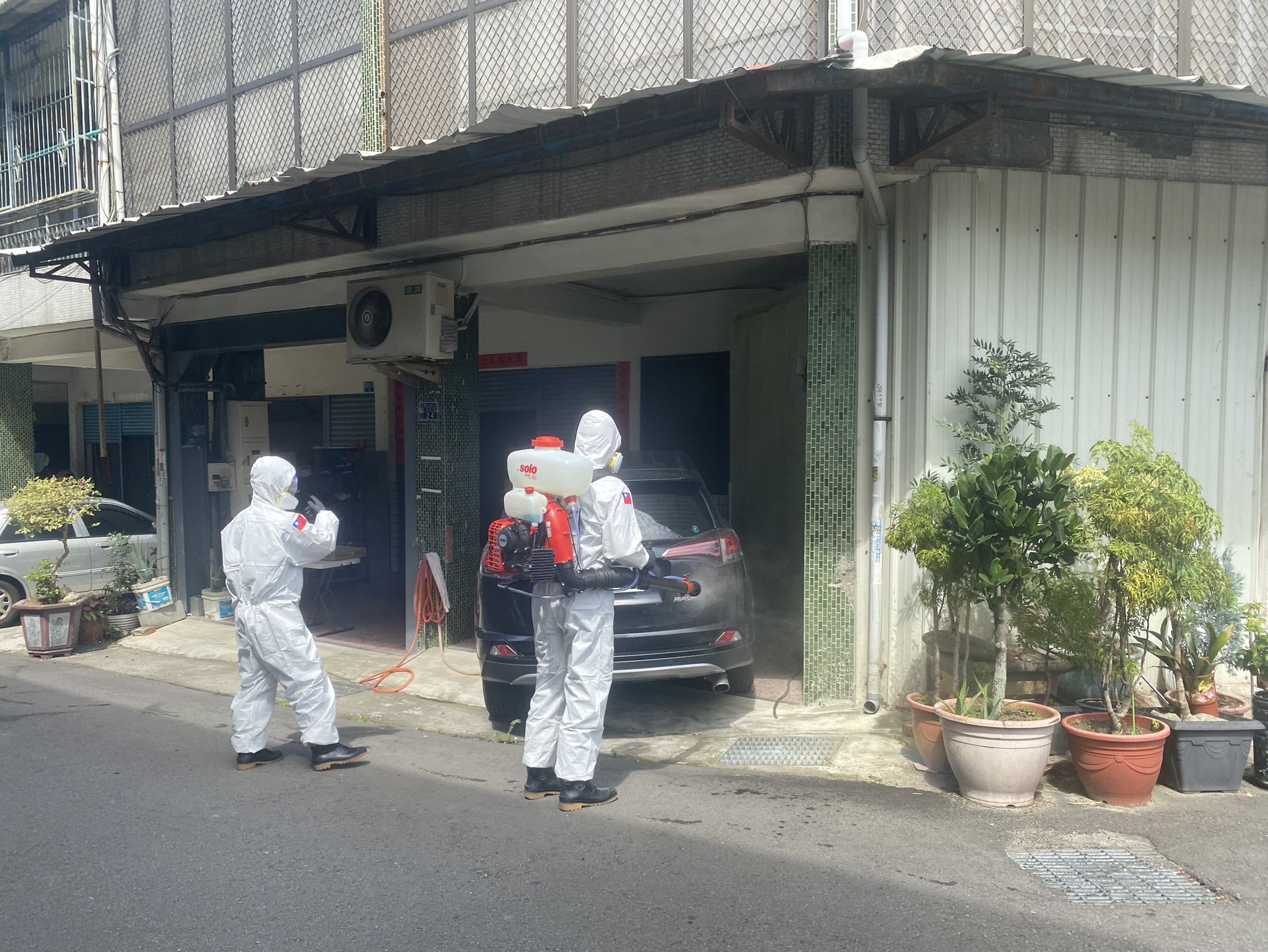 陸軍十軍團今日由楊中校、鄭少校率領36化學兵群16名官兵、出動3.5噸載重車及悍馬車各1輛、背負式消毒器及輕型消毒器各1台,及4台氣霧式消毒器等機具,前進大坑里周邊街道巷弄全面消毒,官兵們頂著烈日,穿梭巷道與民宅之間,以「防疫視同作戰」精神展開清消,確保民眾安全無虞。