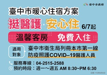 新型冠狀病毒疫情嚴峻,醫護人員站在防疫最前線,為體恤醫護人員辛勞,台中市政府結合各界資源推出醫護暖心住宿方案,針對衛生局列冊照顧COVID-19病患醫事人員,自67日開始提供免費住宿空間。市長盧秀燕表示,有家不敢回的一線醫護人員,可透過醫護暖心住宿旅館好好休息、好好睡覺,作為醫院與家庭的緩衝地帶,「台中不僅守護醫護,更力挺醫護!」