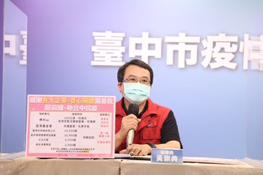 國內疫情仍未趨緩,有感於第一線防疫人員辛勞,各界善心防疫物資及善款湧入,包括N95口罩、醫用口罩、防護衣、隔離衣、防護鏡、防護面罩、乳膠手套、快篩試劑、水冷扇、小型移動式冷氣及社區採檢站採檢設備及物資等。市長盧秀燕感謝民間大力支援,承諾妥善分配防疫物資給第一線警、消、醫護人員及區公所支援人力,讓辛苦的第一線抗疫人員獲得最完善的防護。