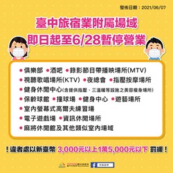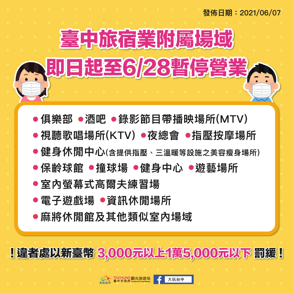 觀旅局說明,為避免造成防疫破口,草悟廣場富地市集營運廠商持續配合延長暫停營業至6月28日,台中旅宿業附屬場域也持續暫停營業,包括俱樂部、酒吧、錄影節目帶播映場所(MTV)、視聽歌唱場所(KTV)、夜總會、指壓按摩場所、健身休閒中心(含提供指壓、三溫暖等設施之美容瘦身場所)、保齡球館、撞球場、健身中心、室內螢幕式高爾夫練習場、遊藝場所、電子遊戲場、資訊休閒場所、麻將休閒館及其他類似室內場域),請民眾配合暫緩涉足,以確保自身及他人安全,共同為防疫盡一份心力。