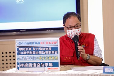 吳局長今日出席台中市流行疫情指揮中心線上記者會指出,市府近日訂定「新冠肺炎死亡個案處理流程」,叮囑各區公所一旦接獲新冠肺炎確診死亡個案通報,應立即啟動關懷流程,由轄區區長或公所主任秘書於第一時間至喪家慰問不須隔離的家屬,喪葬事宜則由區公所及台中市生命禮儀管理處請禮儀業者協助,費用由公所急難救助金支應補助,並再由「新冠肺炎防疫捐款」專戶歸墊;若家眷全數居家隔離,市府也將以電話聯絡授權人,並由生管處協助火化、骨灰暫厝安置等,待往生者家眷居家隔離期滿後,再交由家眷處理後續喪葬事宜。