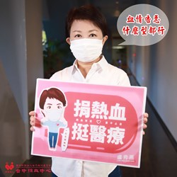 「帶著你的熱血來,什麼型都行!」盧市長提到,疫情影響國人捐血意願,台中血庫急缺各種血型,庫存所剩天數不多,緊急需要輸血的病患正等待關心和救援,由於端午連假將近,需維持一定血庫存量以備不時之需,號召市民在這關鍵辛苦時刻做好防疫措施,一同伸出援手,挽起衣袖捐血救人,捐血有您,愛不止息。