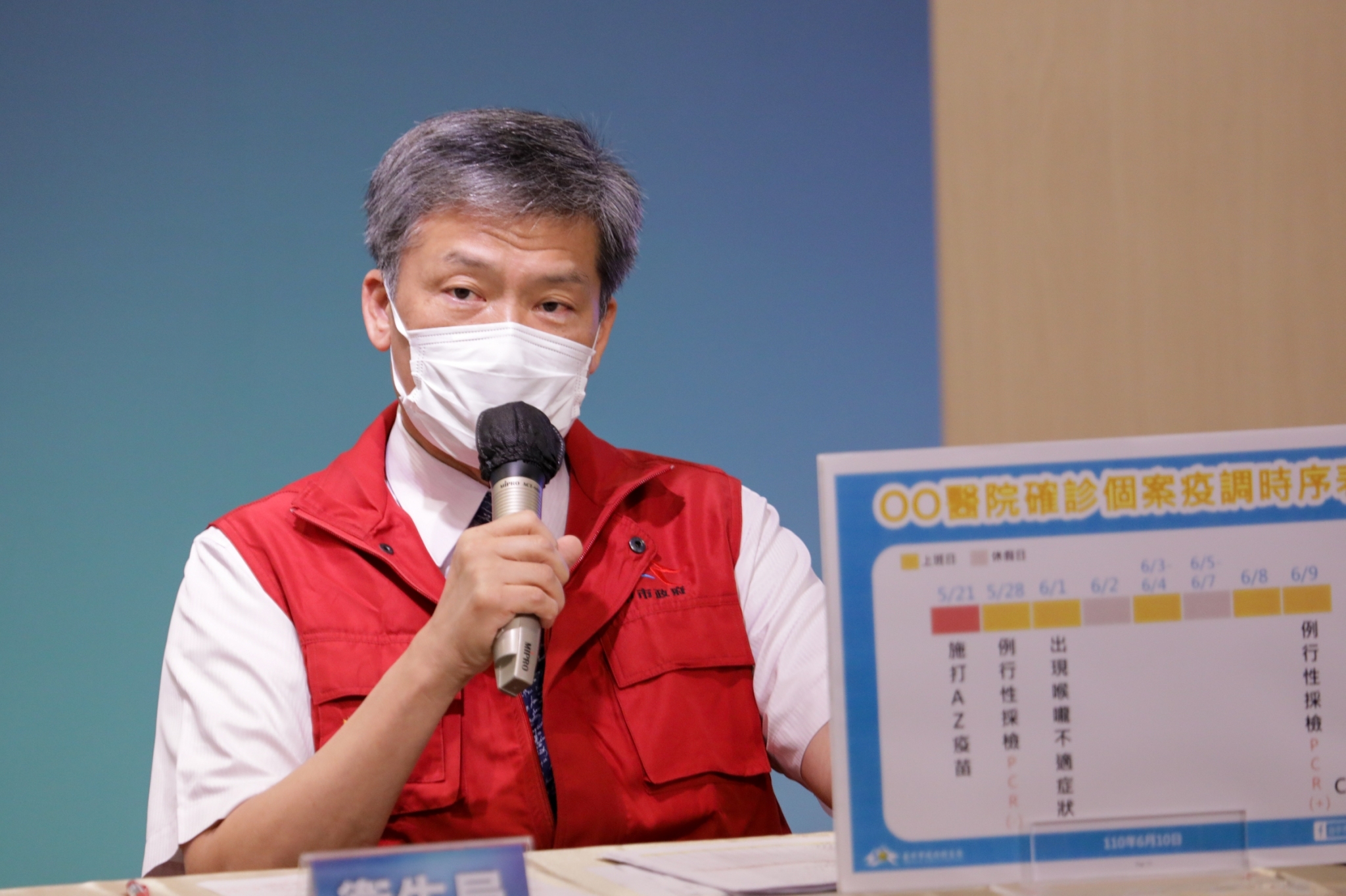 衛生局曾梓展說明疫調情況,他表示,國軍台中總醫院確診護理師5月21日曾施打第一劑AZ疫苗,因此已有一定程度保護力,因其負責COVID-19專責病房,依中央規定每週必須一次PCR採檢,5月28日例行採檢陰性,6月9日例行採檢陽性。