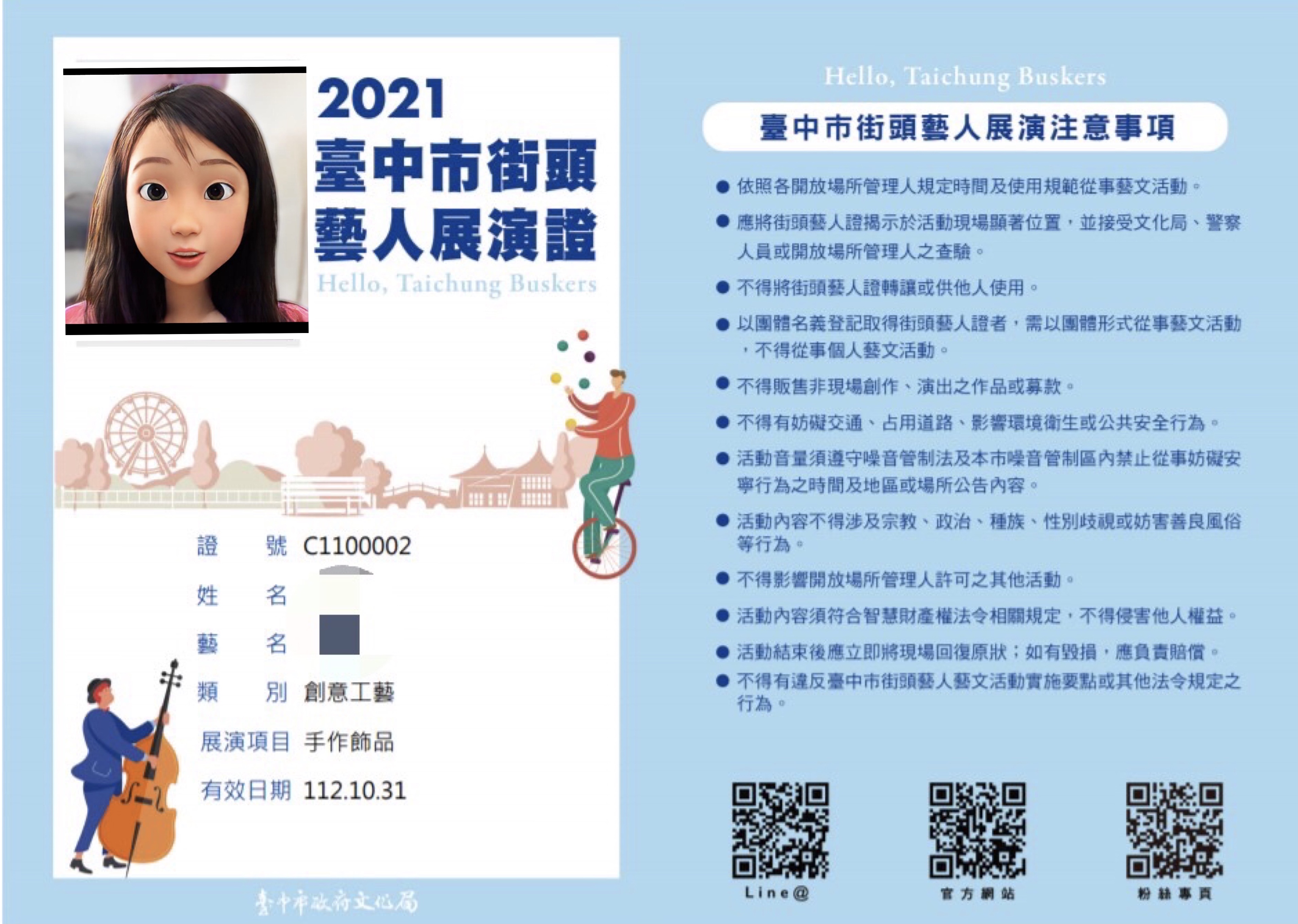 文化局表示,文化局自5月17日起已開放民眾線上登記台中市街頭藝人,申請後於10個工作天內確認資料無誤後儘速核發,截至6月14日止共有960人(組)報名登記,其中個人證890人、團體證70組,目前已陸續核發街頭藝人證,民眾可檢視申請時所填寫的郵件信箱,以免遺漏相關訊息,此外,也可自行至平台下載或列印街頭藝人證,快速又方便。