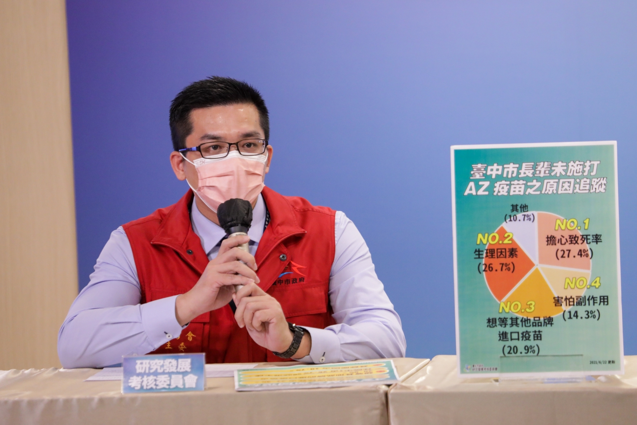 台中市政府關懷年長者未施打AZ疫苗的原因,6月19及20日針對446名長輩未施打疫苗原因進行追蹤調查。市長盧秀燕今(22)日公布,符合資格卻未施打AZ疫苗的長輩,前三大原因以「擔心致死率」最大宗占27.4%、「身體狀況不佳、住院中」占26.7%、「想等其他品牌的疫苗」占20.9%,可見緩打考量為擔心不良反應居多,後續市府會將追蹤分析提供給中央或他縣市參考,也呼籲中央主動就疫苗安全性、風險性進行科學研究,解除疑慮、安定民心!