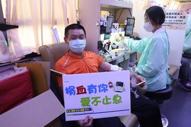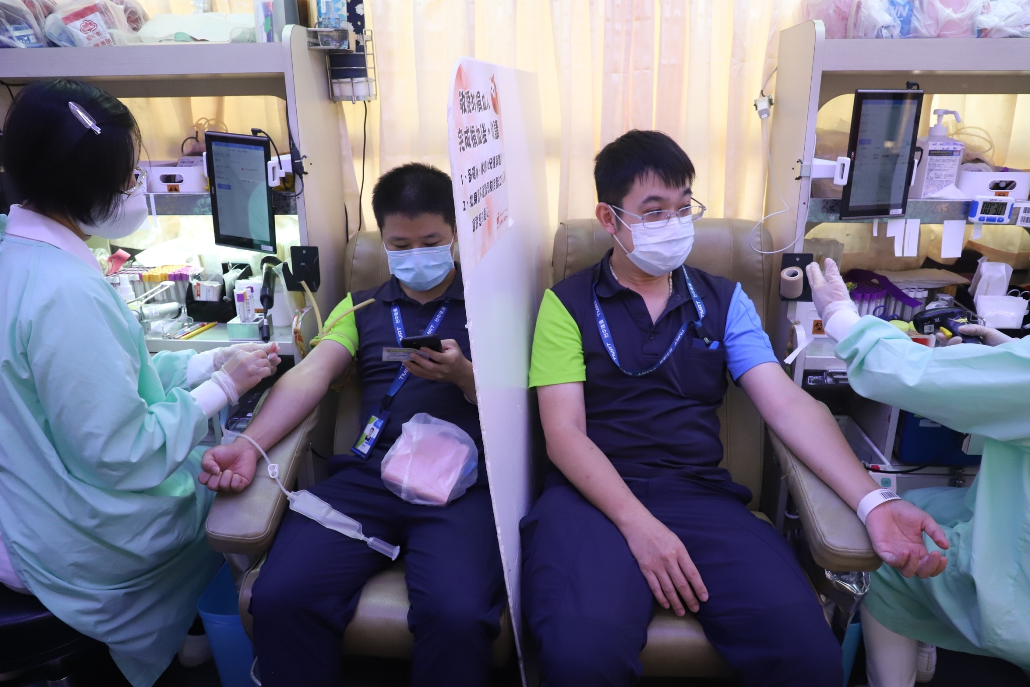 中捷公司員工採取分時分流方式,利用工作之餘前往捐血,許多員工都有多年捐血資歷。其中,總經理莊明聰捐血資歷約40年,已經捐血61次,今天一口氣捐500CC;副總經理葉進財今天捐了250CC,他表示,想到可以助人就熱血奔騰。