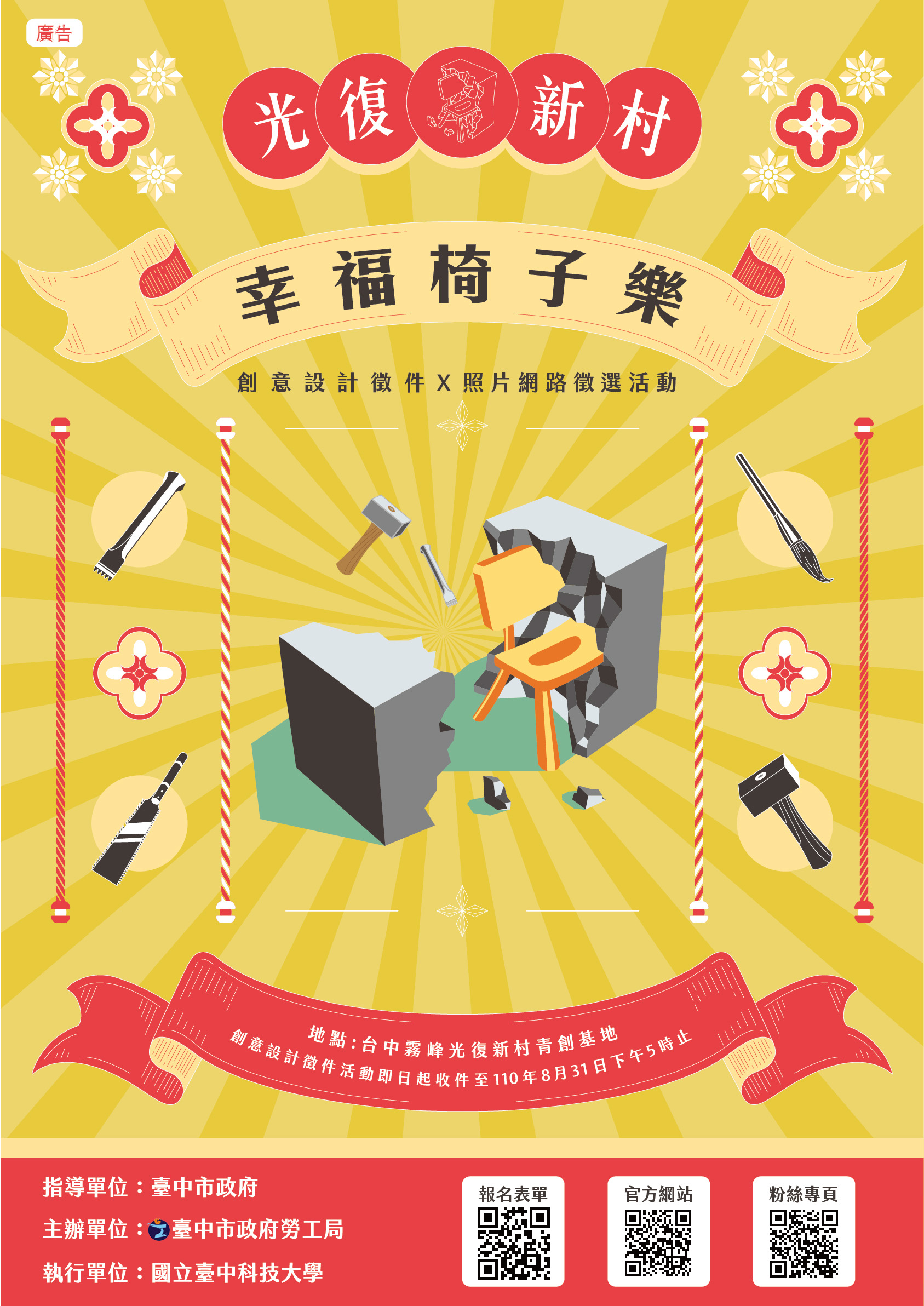 激發青年創意,台中市政府勞工局在光復新村青創基地推出「幸福椅子樂」設計活動,邀請年輕學子以生活中的物品「椅子」作為創意發想來源,即日起至8月31日公開徵件,開放就讀台中高中(職)以上在校學生,以個人或組隊參賽,將選出5組優選,每組可獲得5000元獎金,歡迎學子踴躍報名。