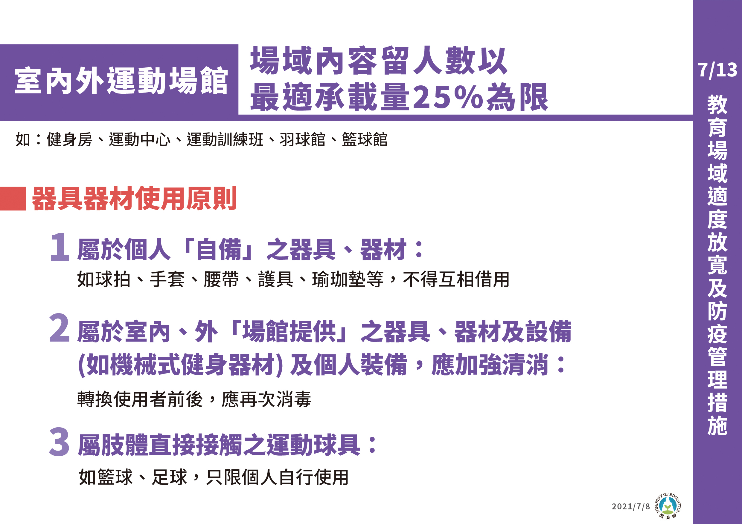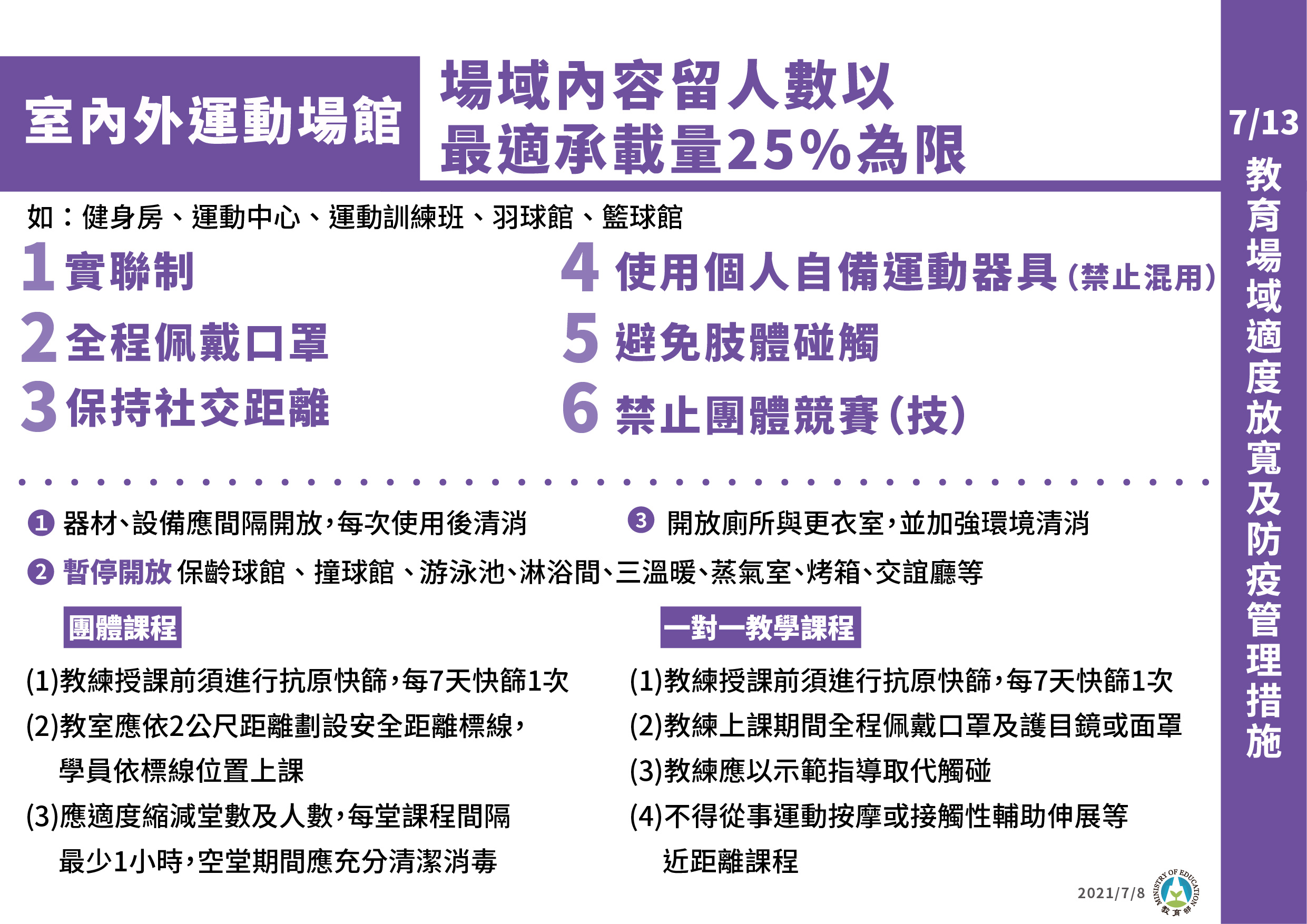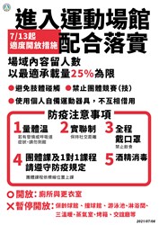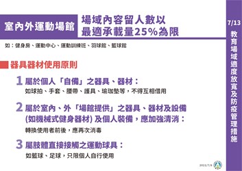 運動局指出,此次適度開放範圍的場館業者,應遵循體育署所訂定的管制原則及防疫措施,包含場域內容留人數以最適承載量25%為限、落實實聯制、全程佩戴口罩、保持社交距離、使用個人自備運動器具(禁止混用)、避免肢體接觸、禁止團體競賽(競技)、器材、設備應間隔開放使用,每次使用清消、開放廁所及更衣室,並加強環境清消、禁止開放游泳池、淋浴間、三溫暖、蒸氣室、烤箱、交誼廳等、教練授課前須進行抗原快篩,每7天快篩一次。