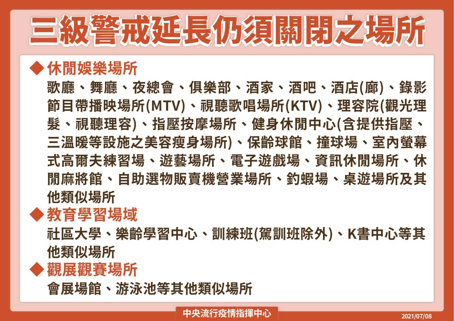 運動局說明,非屬此次體育署公告適度開放對象者,包含游泳池、保齡球館、撞球館等類似場所,仍應依三級警戒延長關閉至726日。