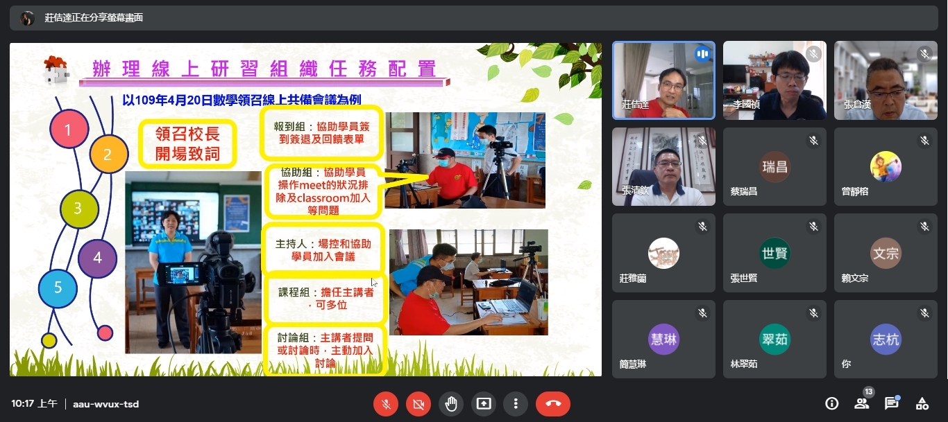 國民教育輔導團數學領域國中輔導小組召集人顏慧萍表示,此次研習將重心放在以小組為單位的系統思考,探究線上研習的前置佈局脈絡、豐富資源審核與應用策略、後續管理困難與常見技術問題的排解等,以支持各領域/議題輔導小組發展適性的線上教師增能活動,跳脫教師專業發展的思維框架,有效因應疫情與未來科技趨勢。