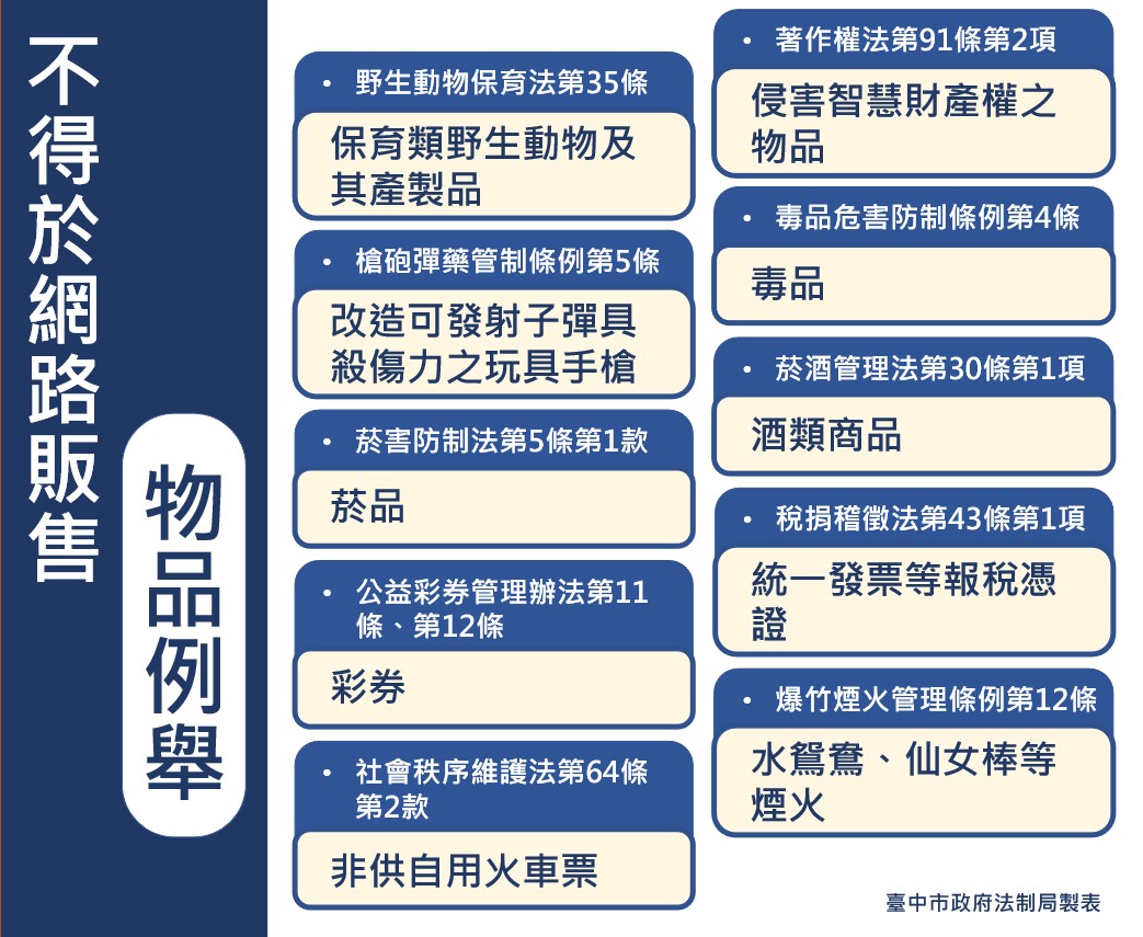 由於受到疫情的影響,相較於過去實體通路的購物型態,現下透過虛擬通路以網路購物的方式,明顯改變了民眾的消費習慣。李善植局長並再次提醒,除了上述藥事法規定無照不得販賣醫療器材藥品外,法制局特別列舉了其他像是保育類野生動物及其產製品、菸酒、煙火等10類物品,依據野生動物保育法等相關規定,因無法辨識消費者年齡、或為違禁品等,亦不得透過網路方式銷售。因此,民眾如要在網路上銷售商品,應確實瞭解相關規定或向主管機關查詢,避免誤觸法規受罰,讓荷包失血。(7/17*15)*法制局